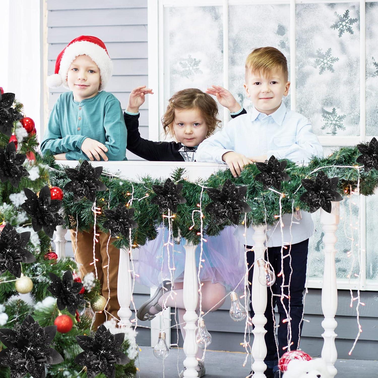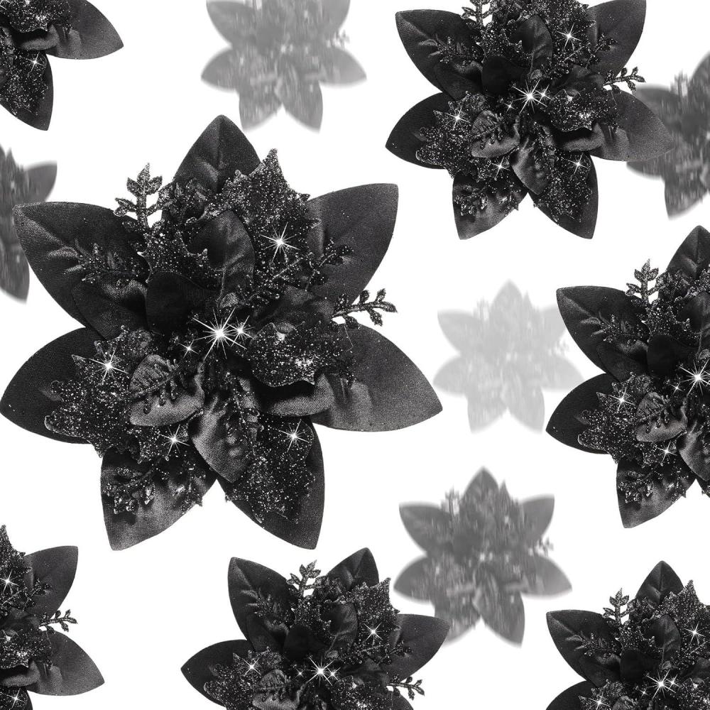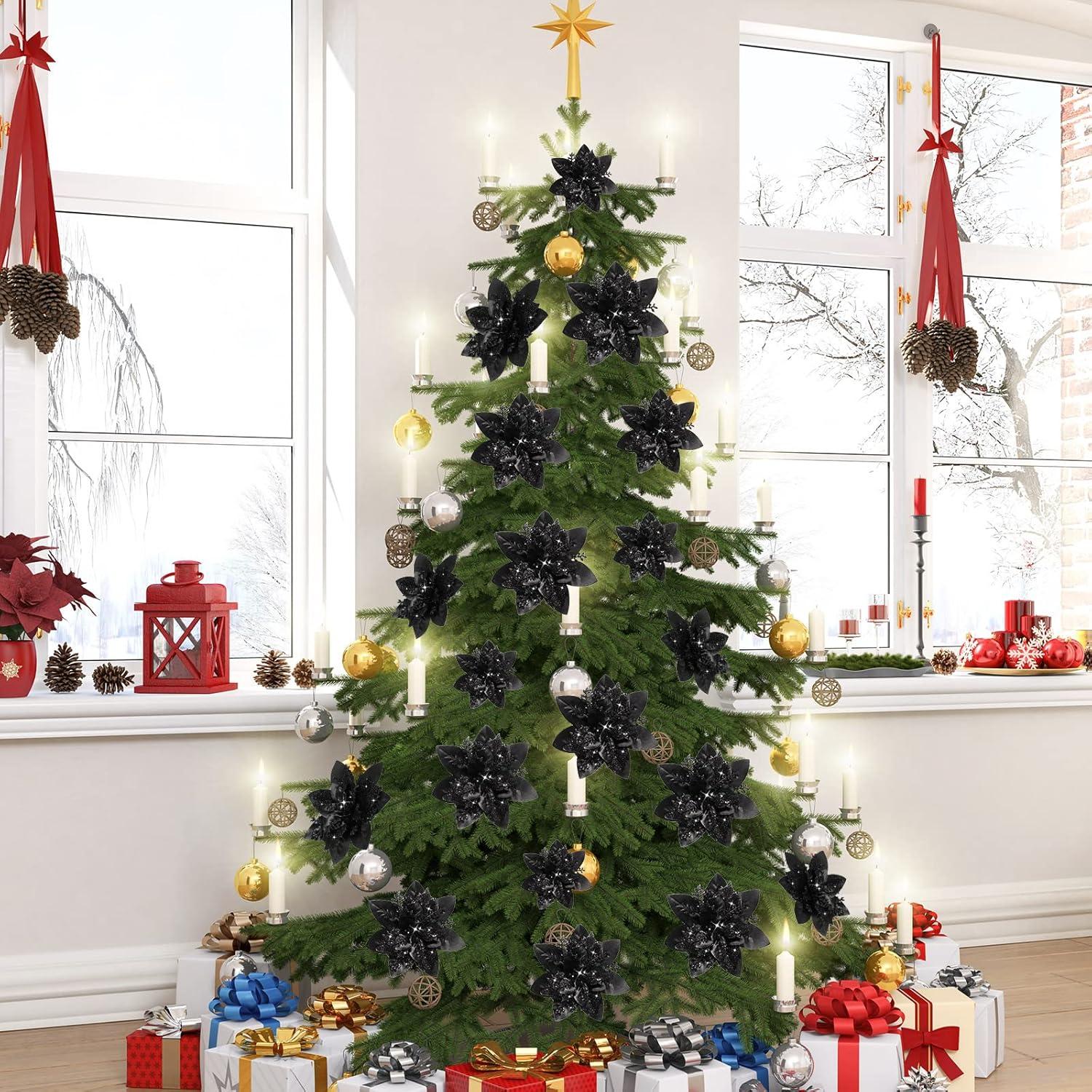 image24 Christmas Glitter Artificial Poinsettia Flowers Xmas Poinsettia Artificial Wedding Flowers Decorations Xmas Tree Ornaments with Clips for Party Favors 6 Inch 4 Inch 3 Inch Silver and BlueBlack White  Gold
