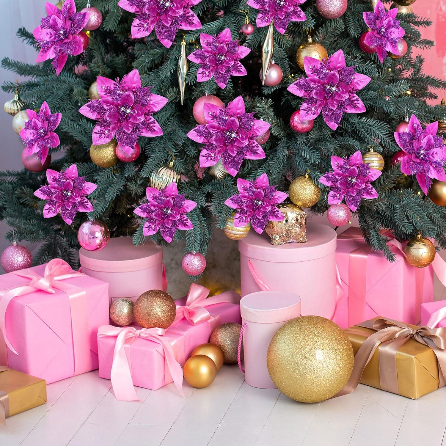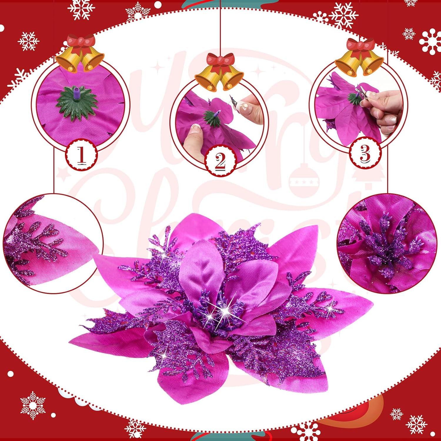 image24 Christmas Glitter Artificial Poinsettia Flowers Xmas Poinsettia Artificial Wedding Flowers Decorations Xmas Tree Ornaments with Clips for Party Favors 6 Inch 4 Inch 3 Inch Silver and BlueFuchsia