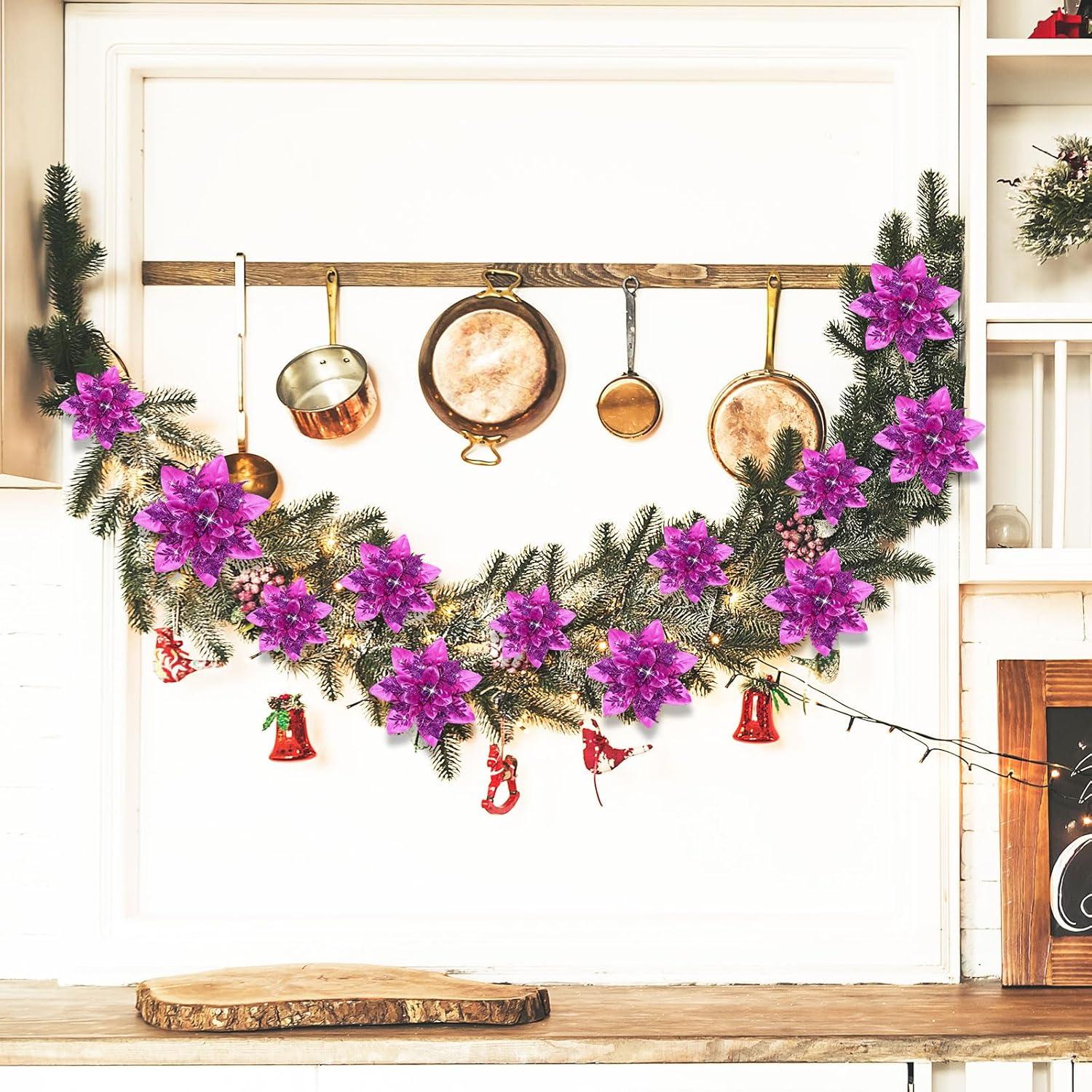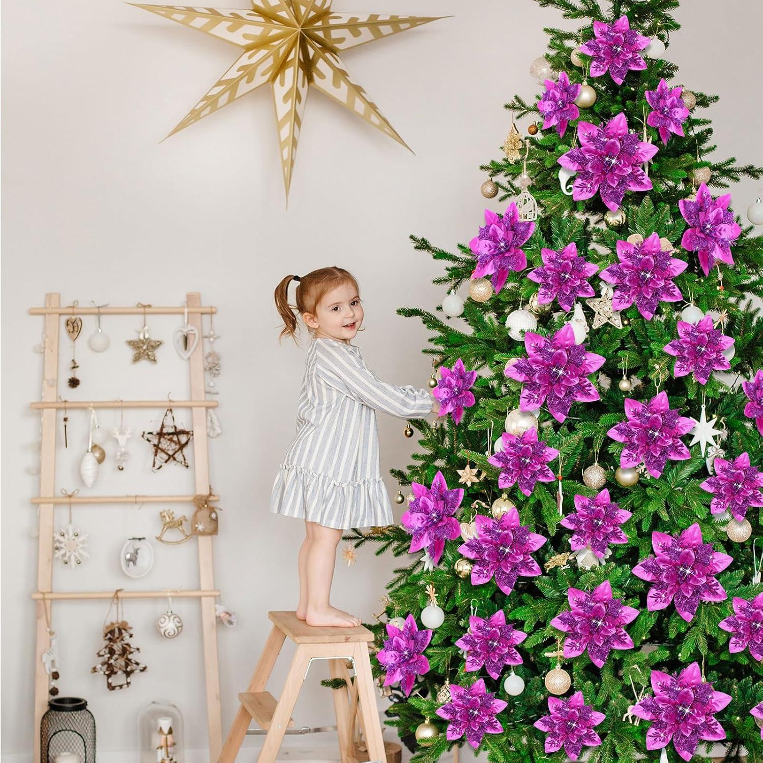 image24 Christmas Glitter Artificial Poinsettia Flowers Xmas Poinsettia Artificial Wedding Flowers Decorations Xmas Tree Ornaments with Clips for Party Favors 6 Inch 4 Inch 3 Inch Silver and BlueDark Purple