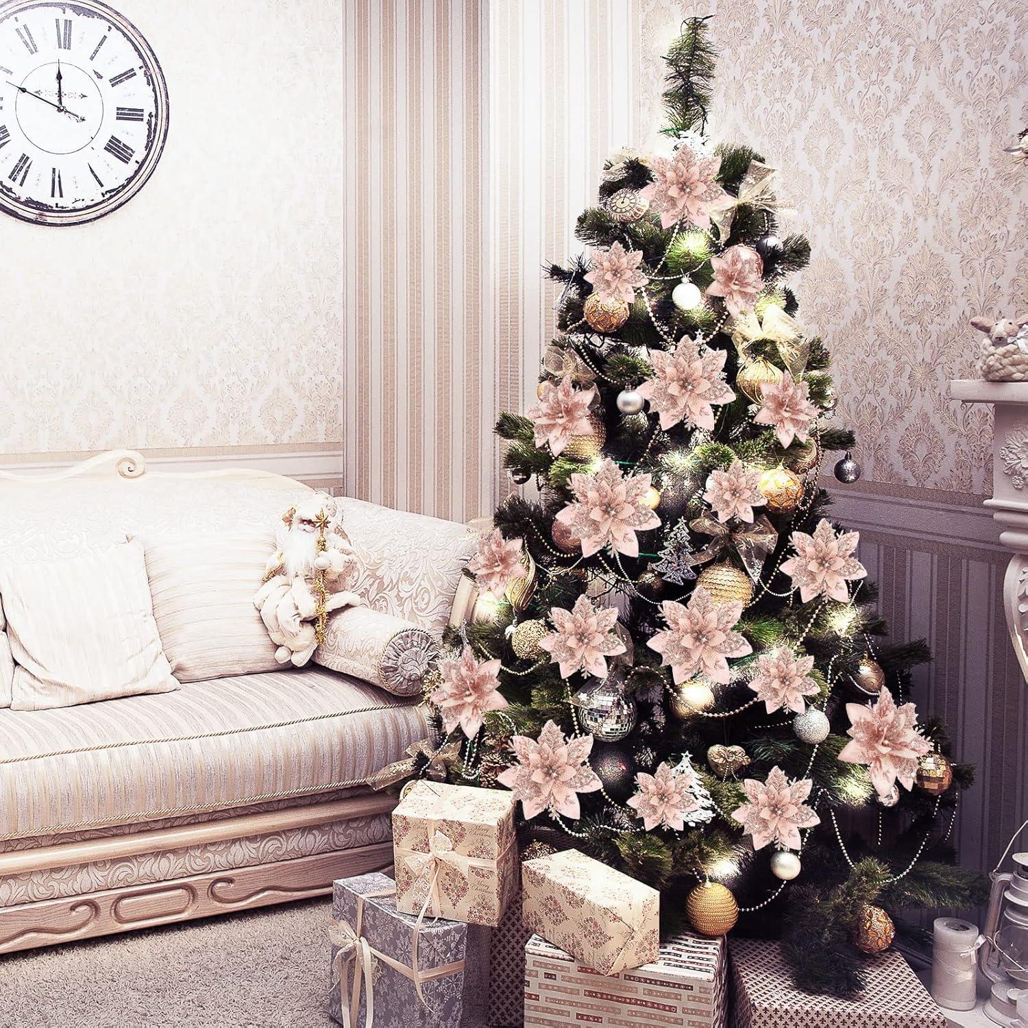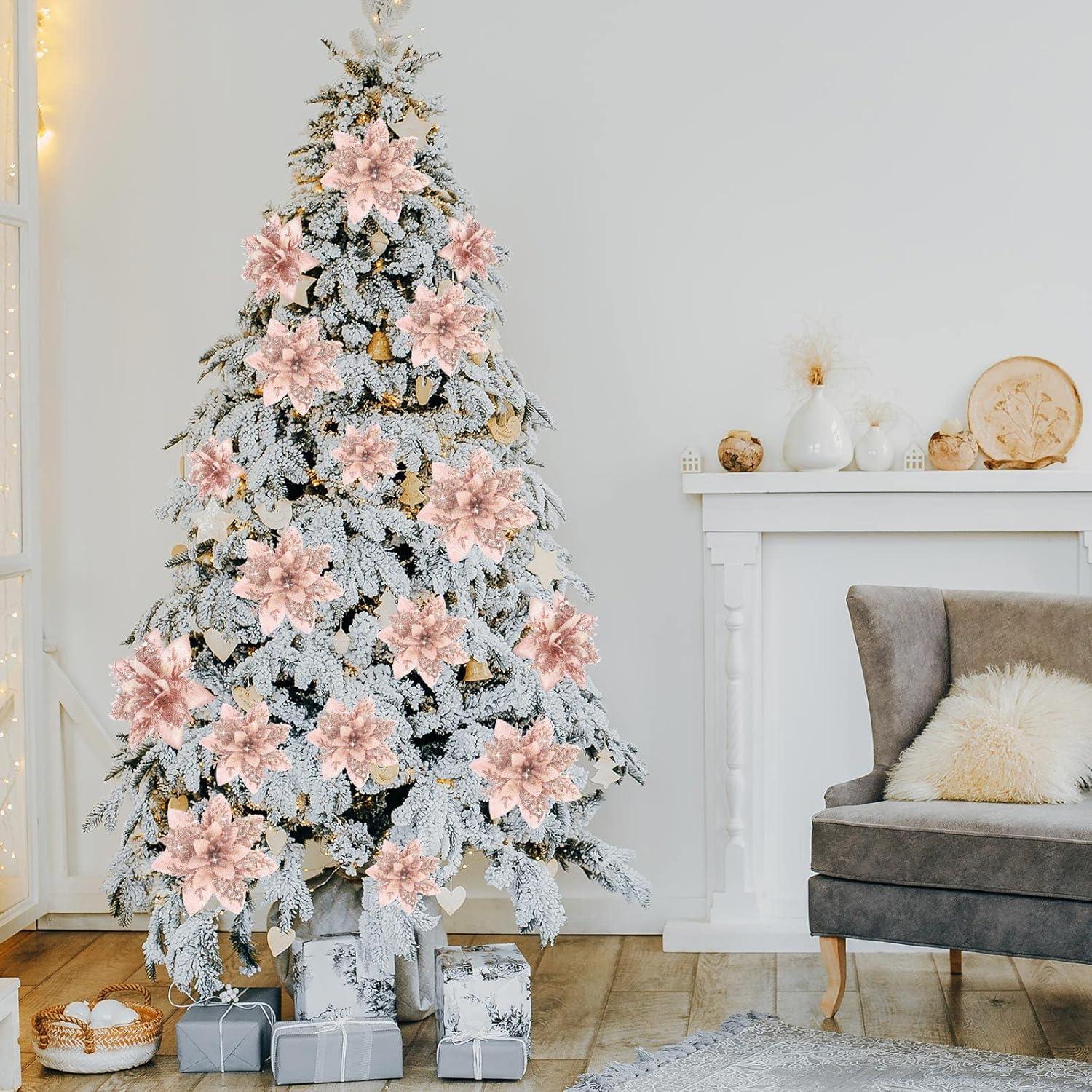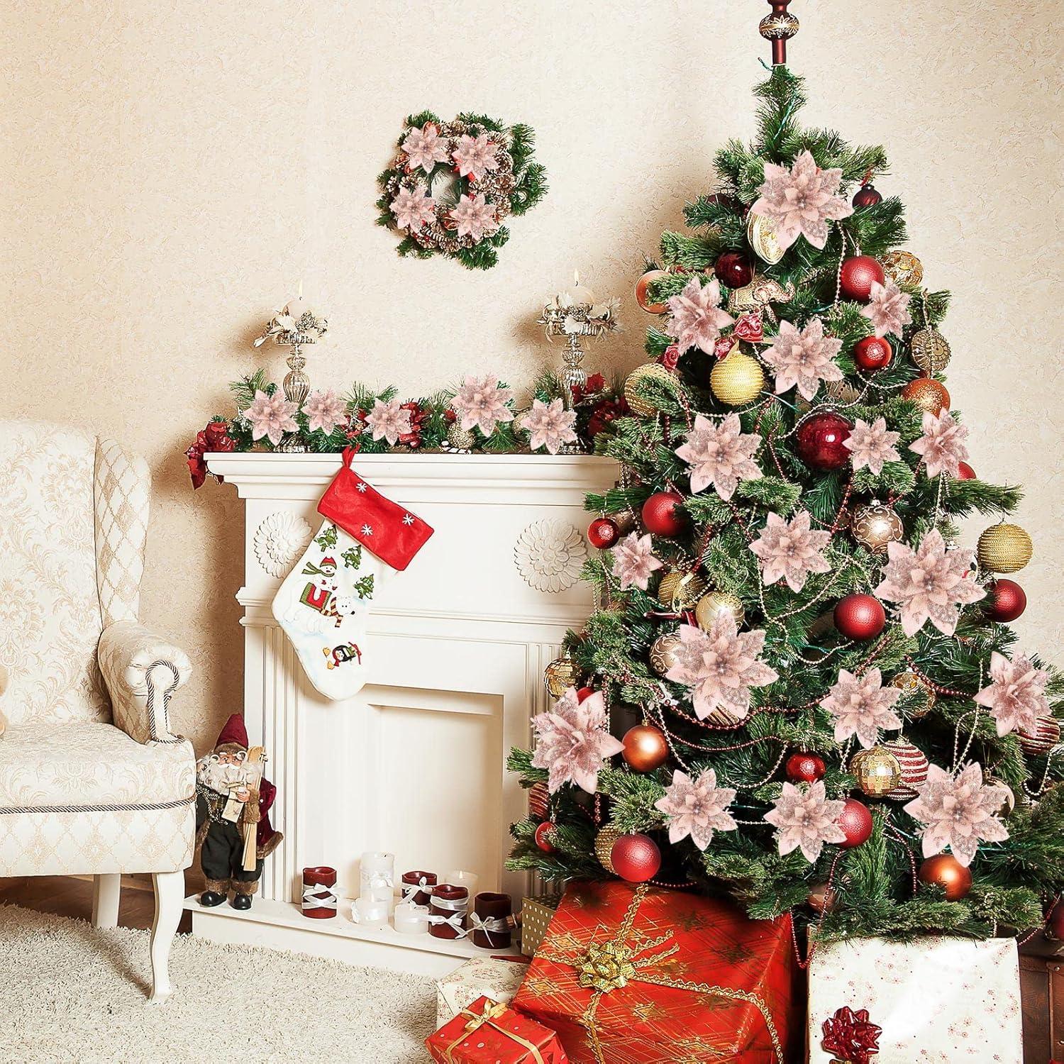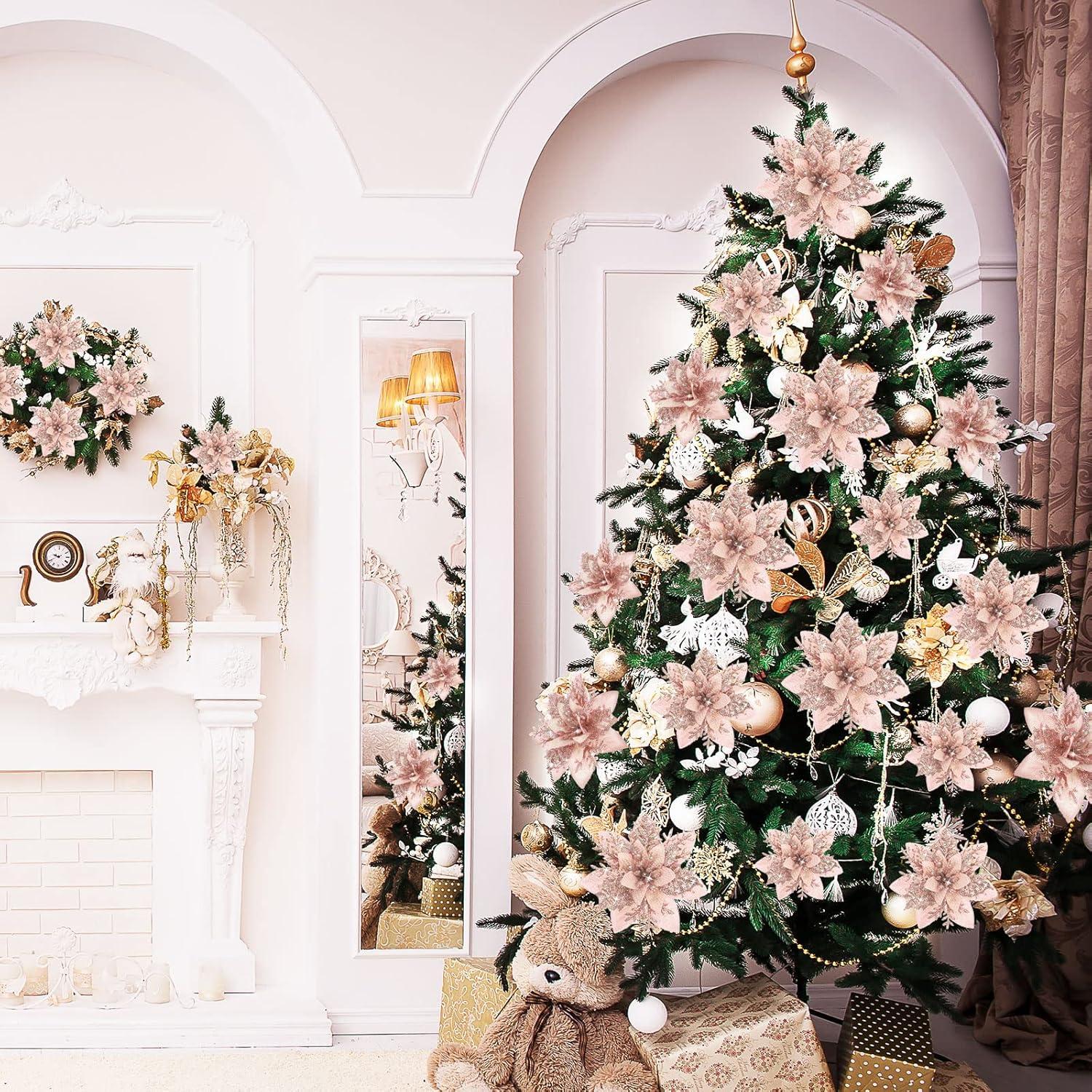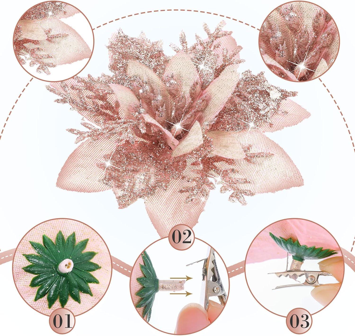 image24 Christmas Glitter Artificial Poinsettia Flowers Xmas Poinsettia Artificial Wedding Flowers Decorations Xmas Tree Ornaments with Clips for Party Favors 6 Inch 4 Inch 3 Inch Silver and BlueRose Gold