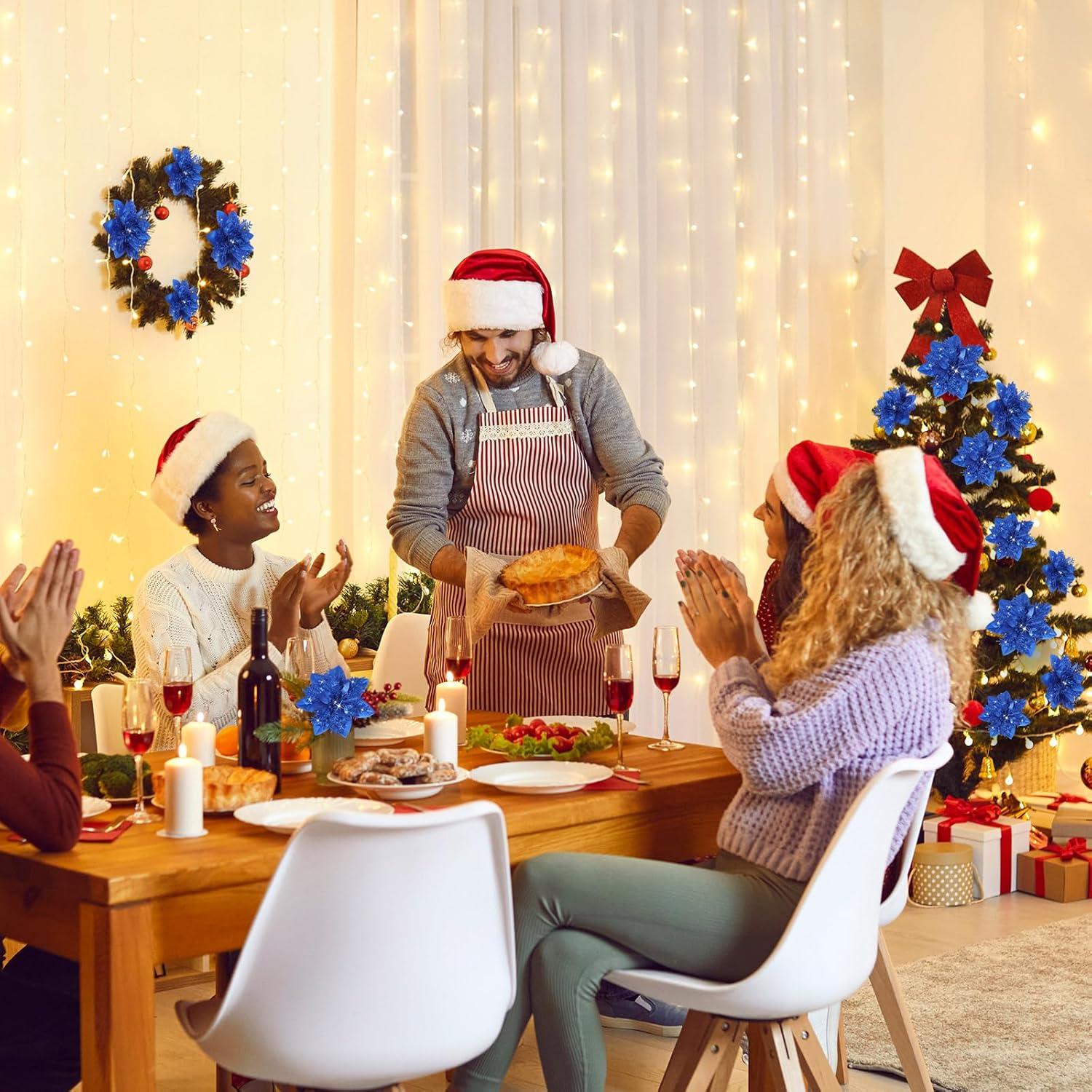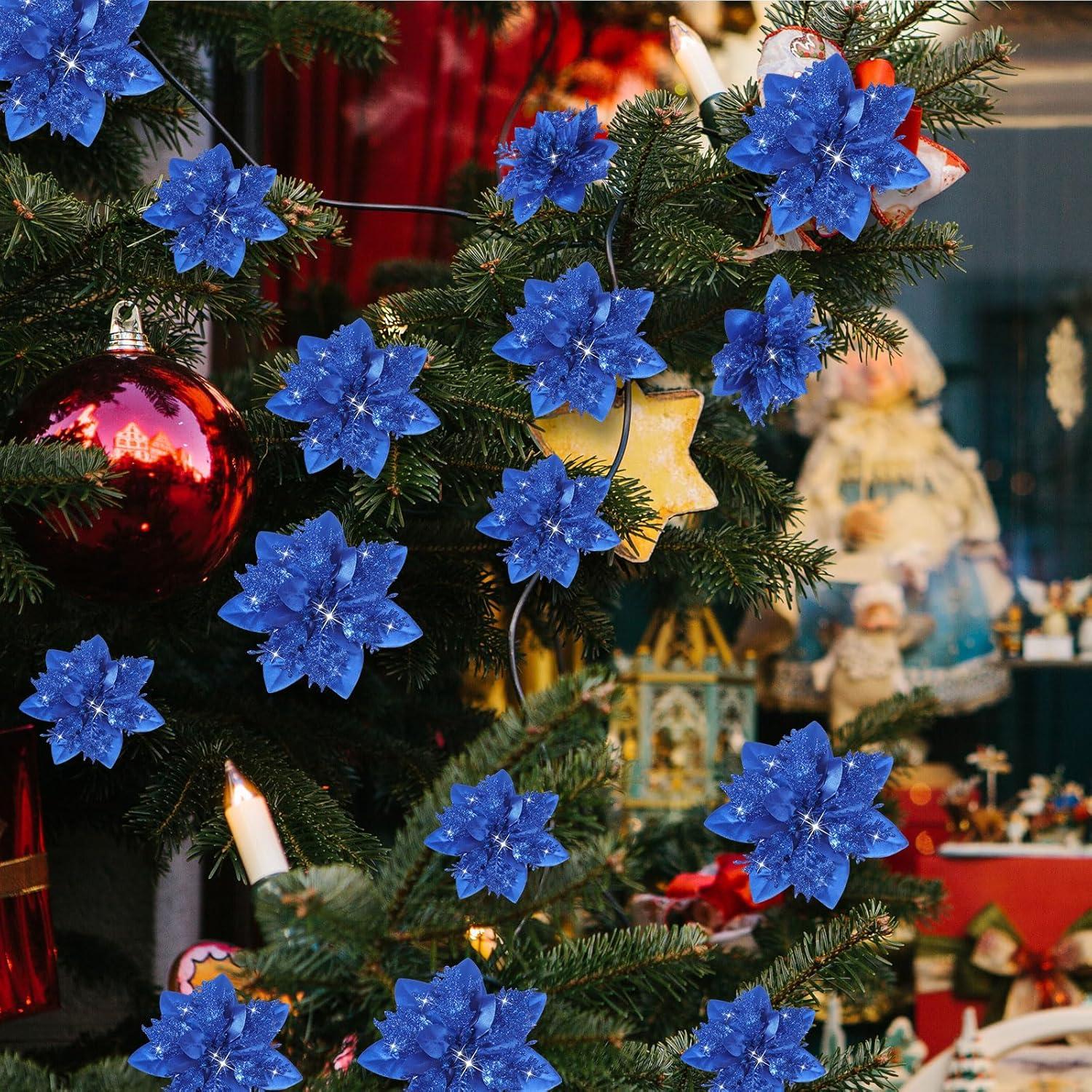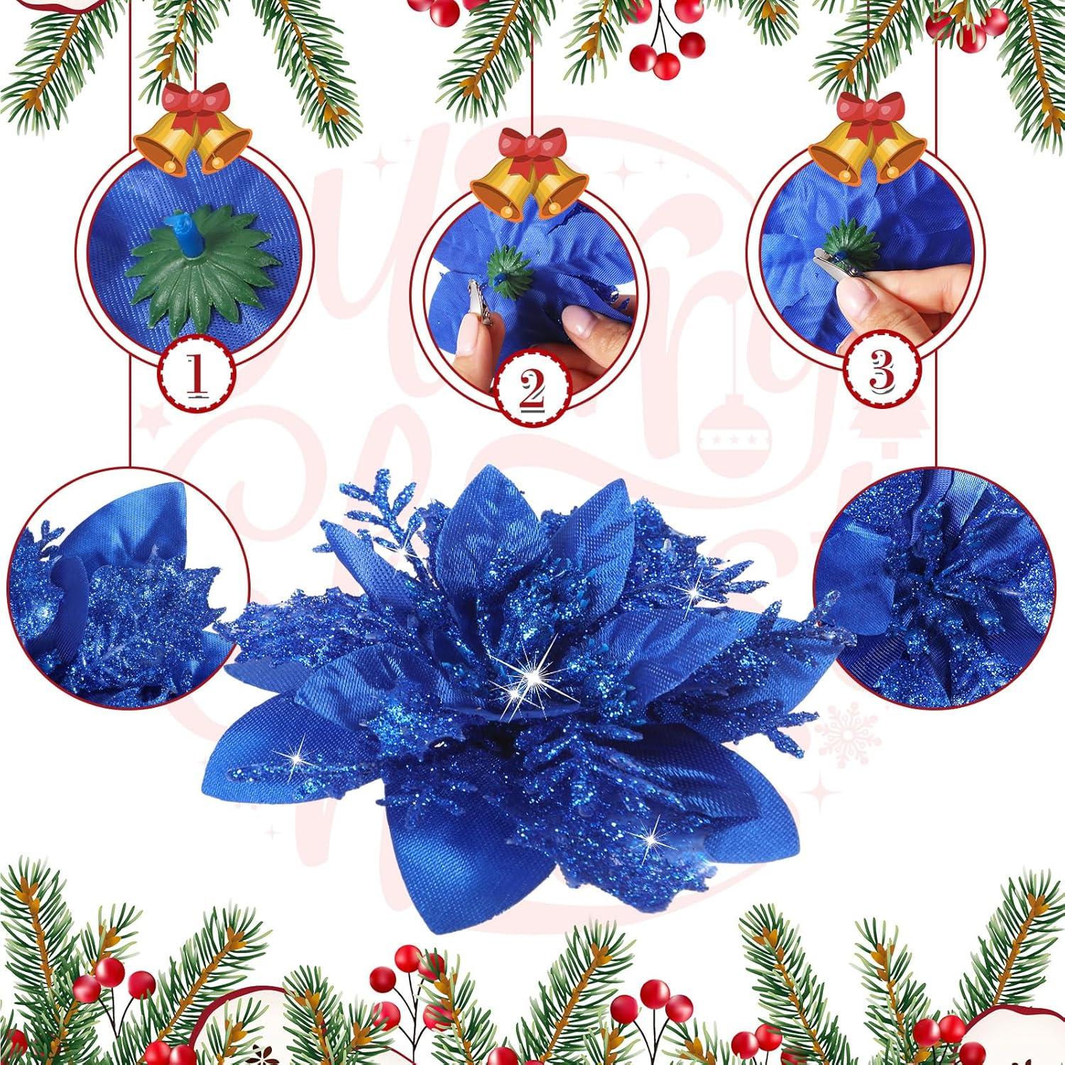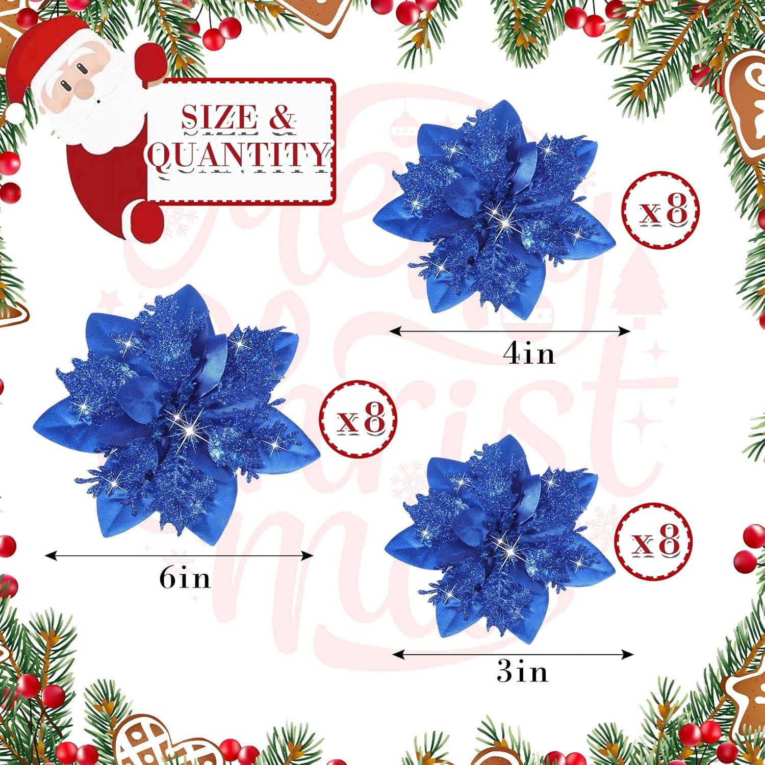 image24 Christmas Glitter Artificial Poinsettia Flowers Xmas Poinsettia Artificial Wedding Flowers Decorations Xmas Tree Ornaments with Clips for Party Favors 6 Inch 4 Inch 3 Inch Silver and BlueRoyal Blue