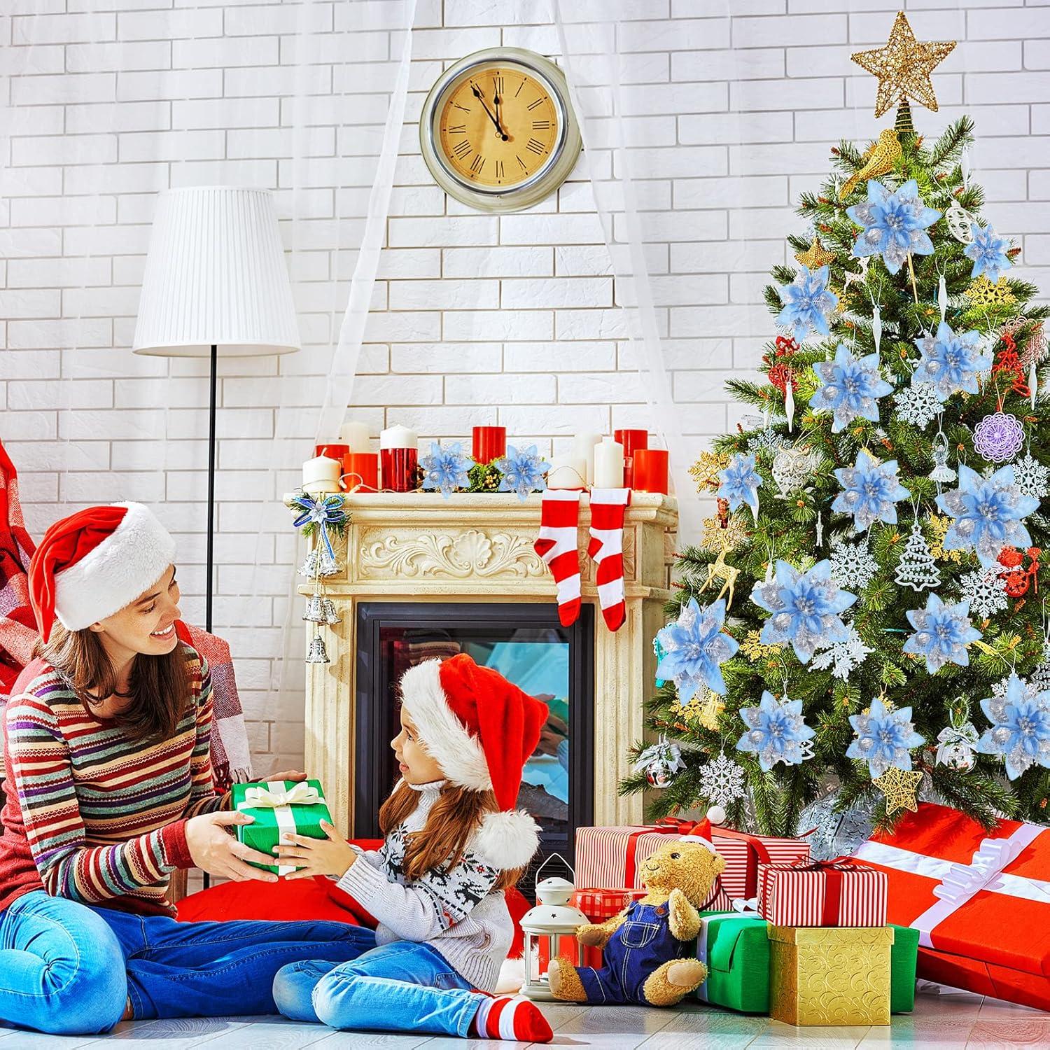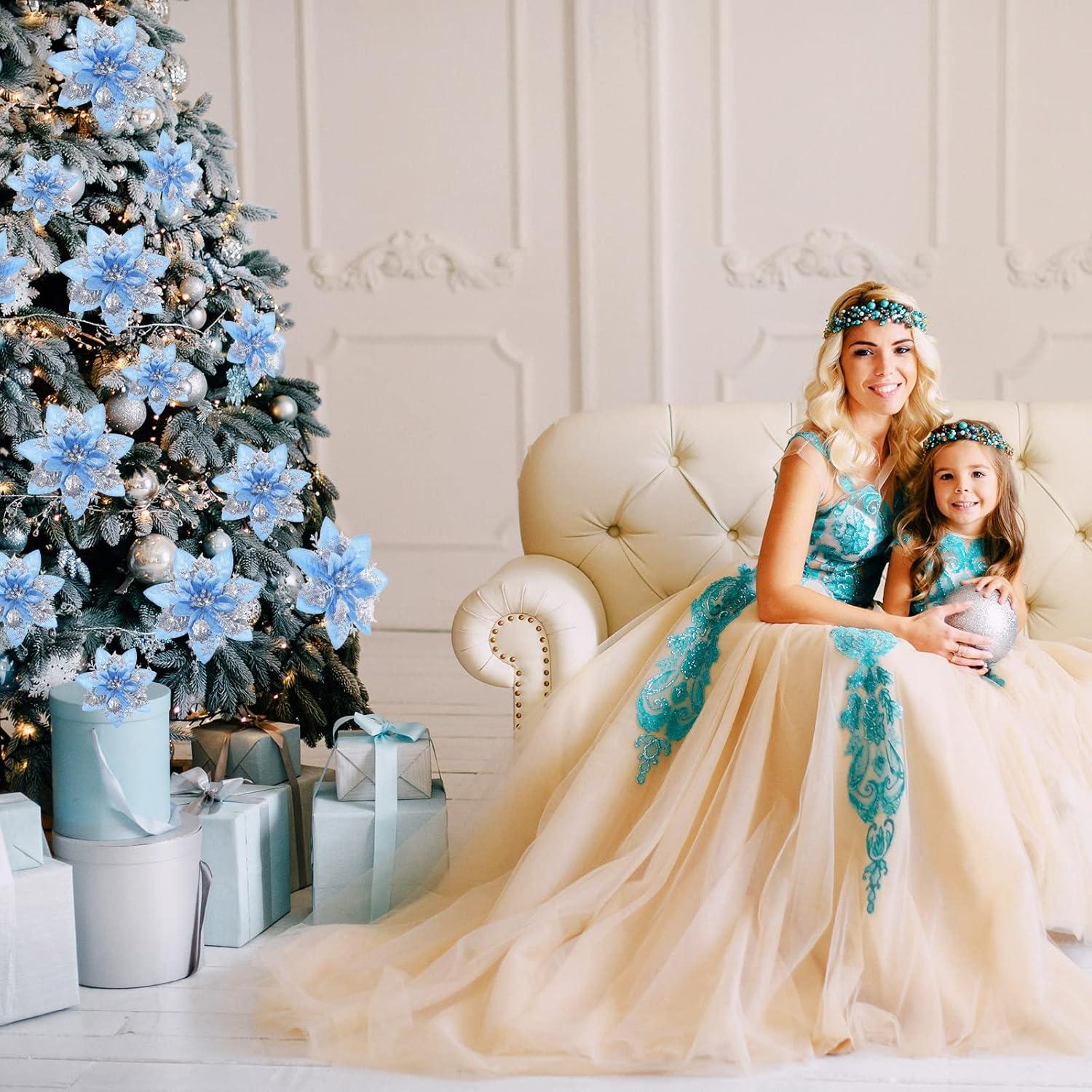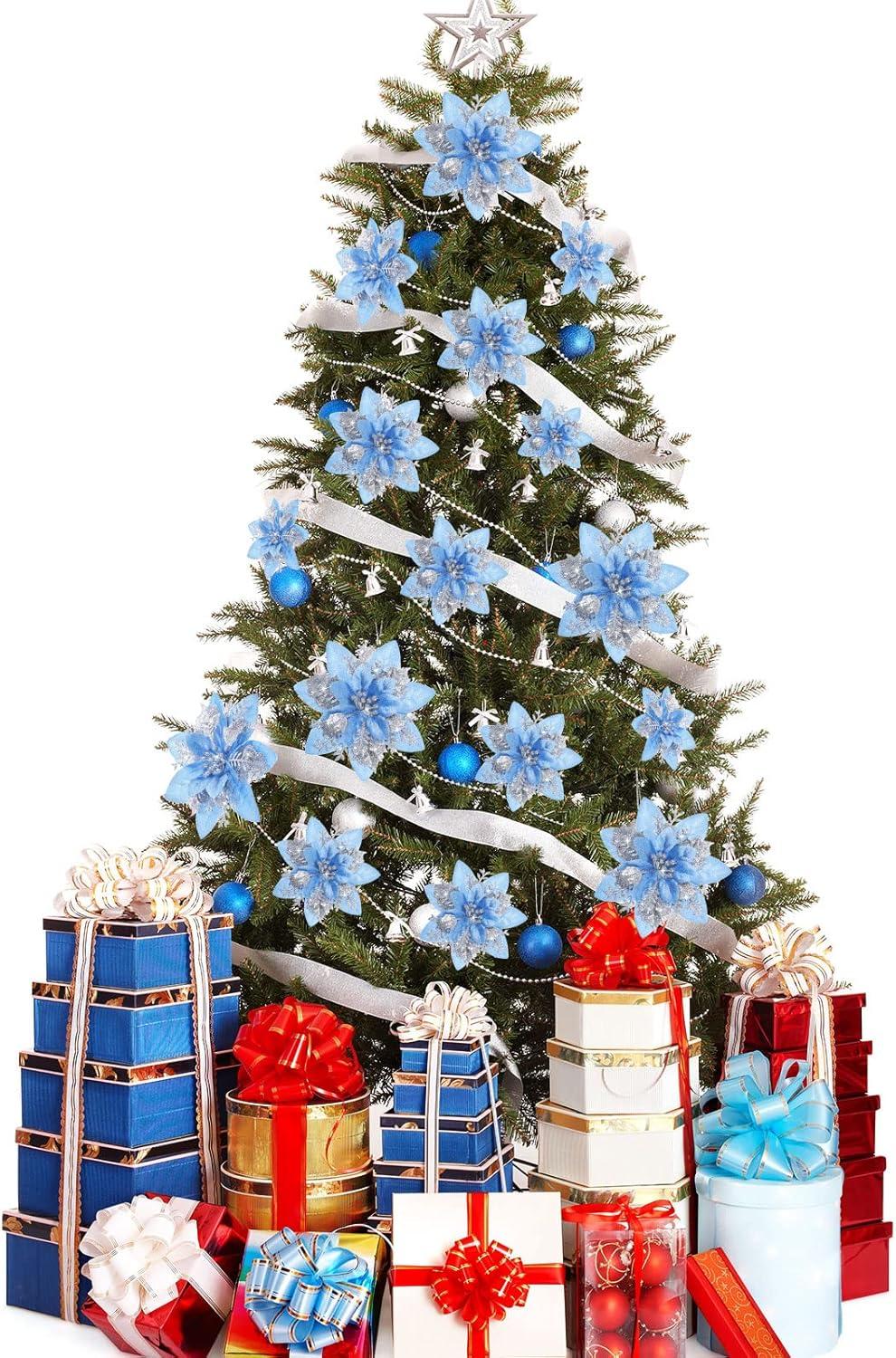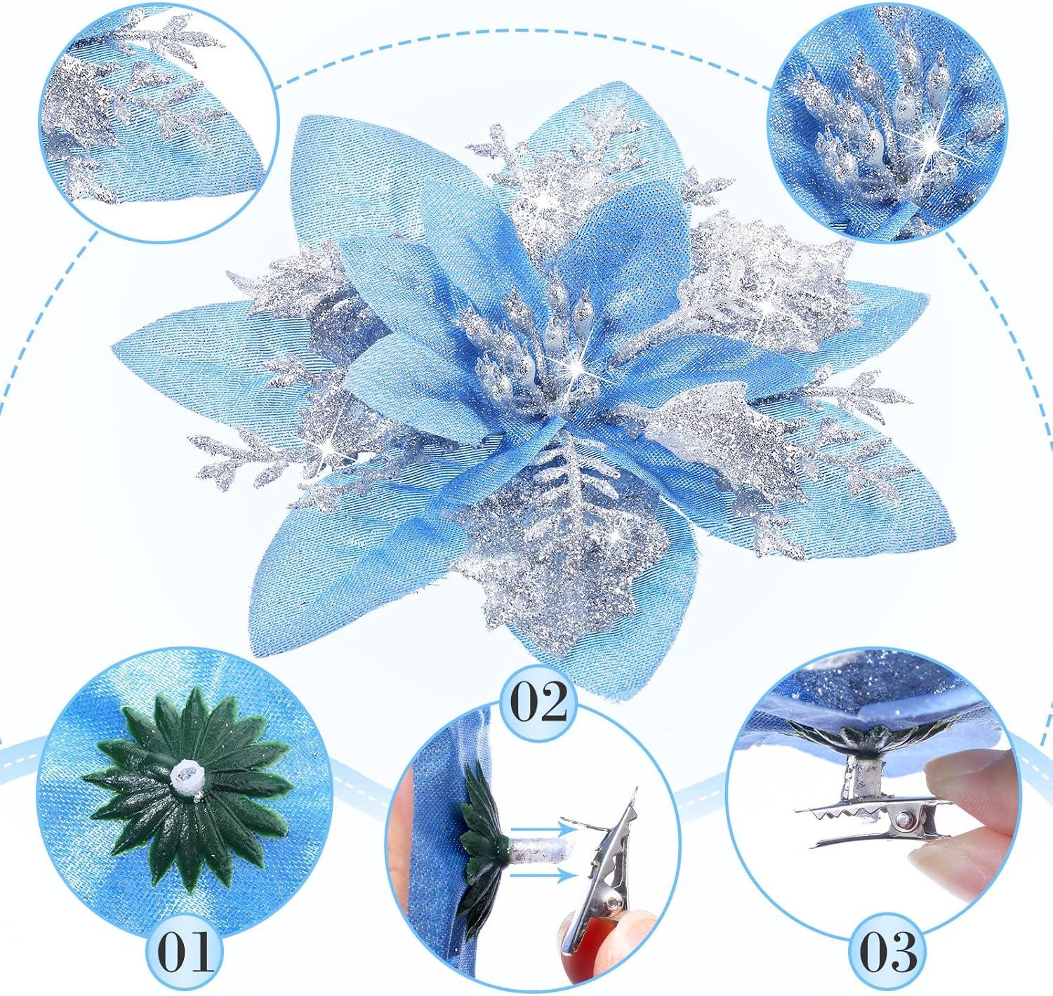 image24 Christmas Glitter Artificial Poinsettia Flowers Xmas Poinsettia Artificial Wedding Flowers Decorations Xmas Tree Ornaments with Clips for Party Favors 6 Inch 4 Inch 3 Inch Silver and BlueSilver and Blue