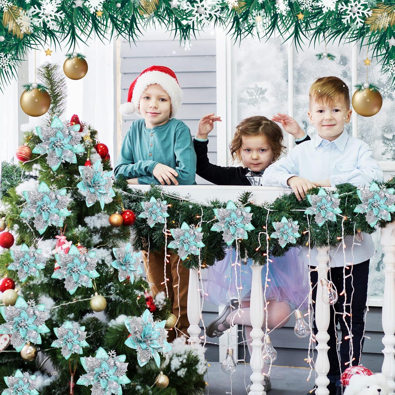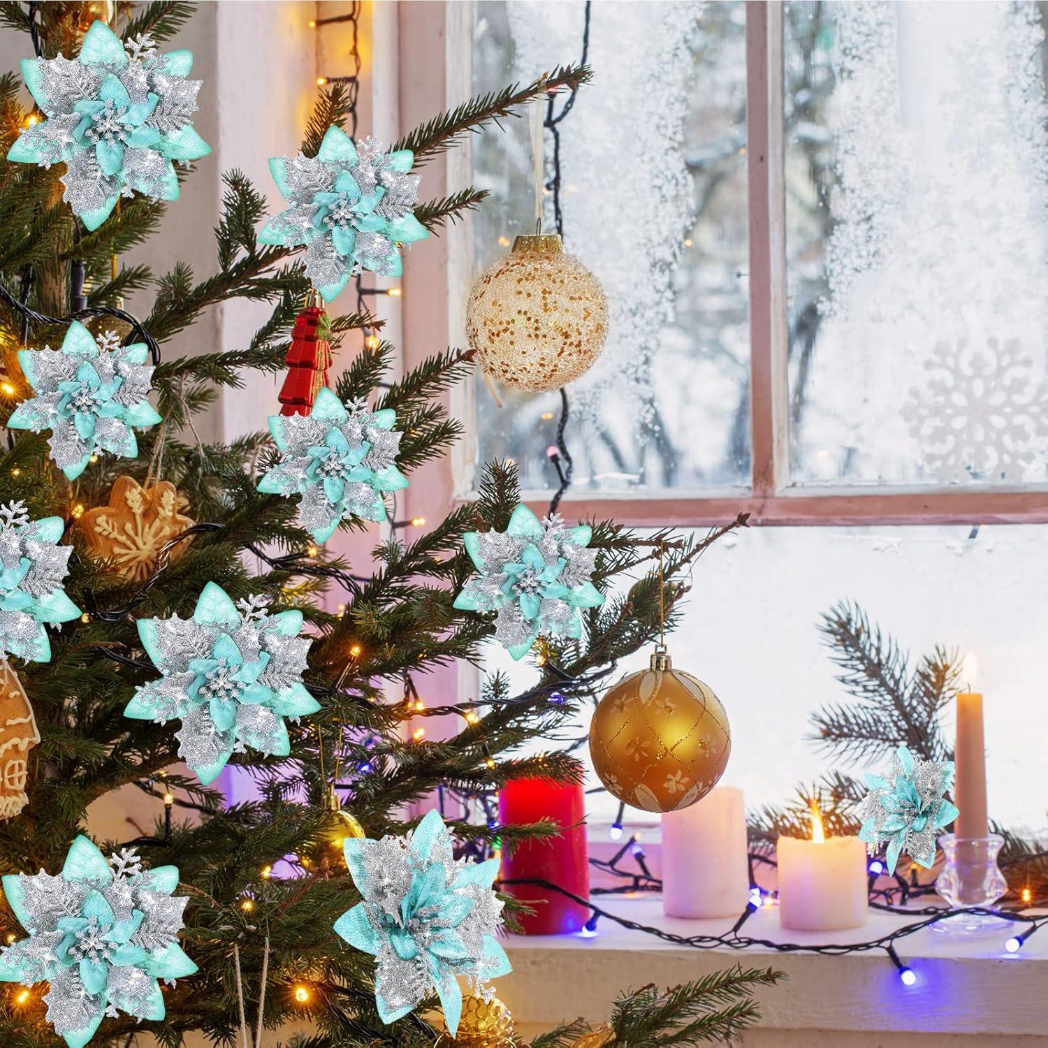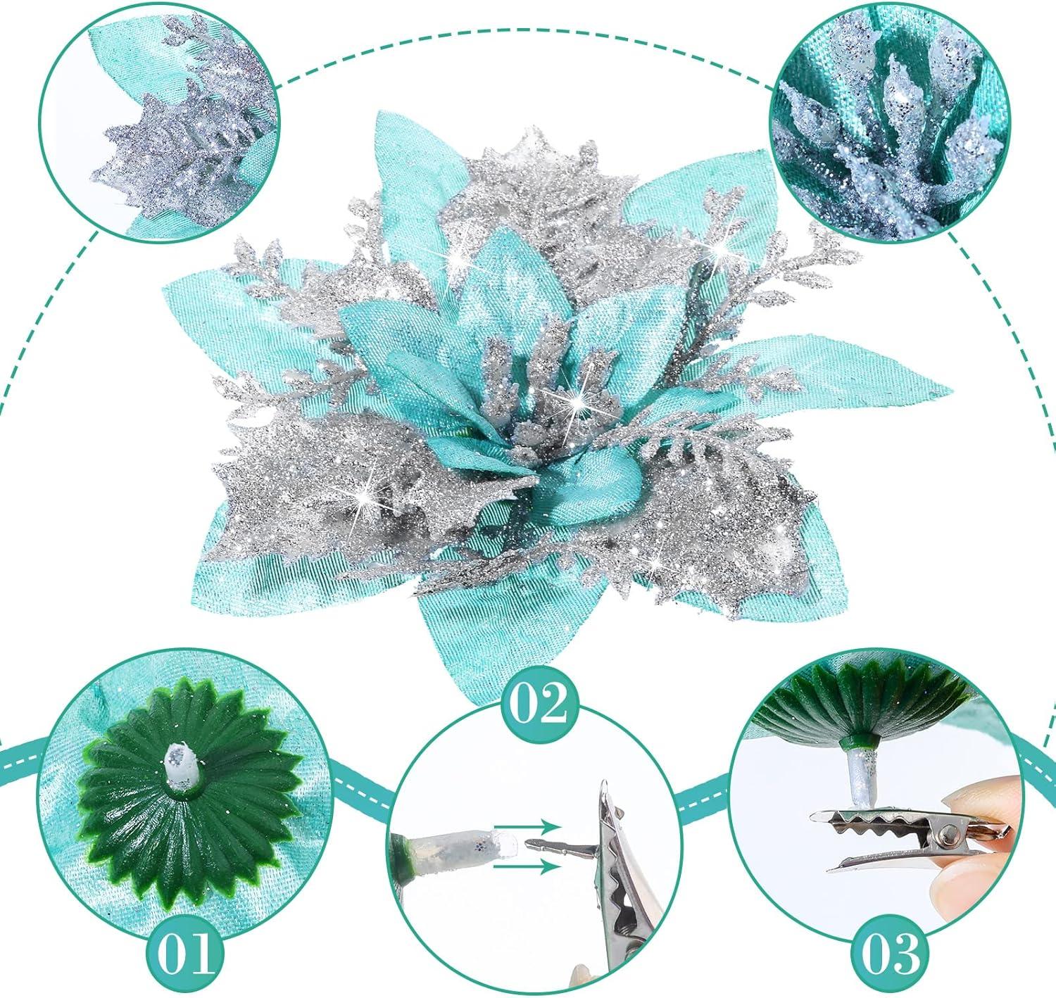 image24 Christmas Glitter Artificial Poinsettia Flowers Xmas Poinsettia Artificial Wedding Flowers Decorations Xmas Tree Ornaments with Clips for Party Favors 6 Inch 4 Inch 3 Inch Silver and BlueSilver and Green