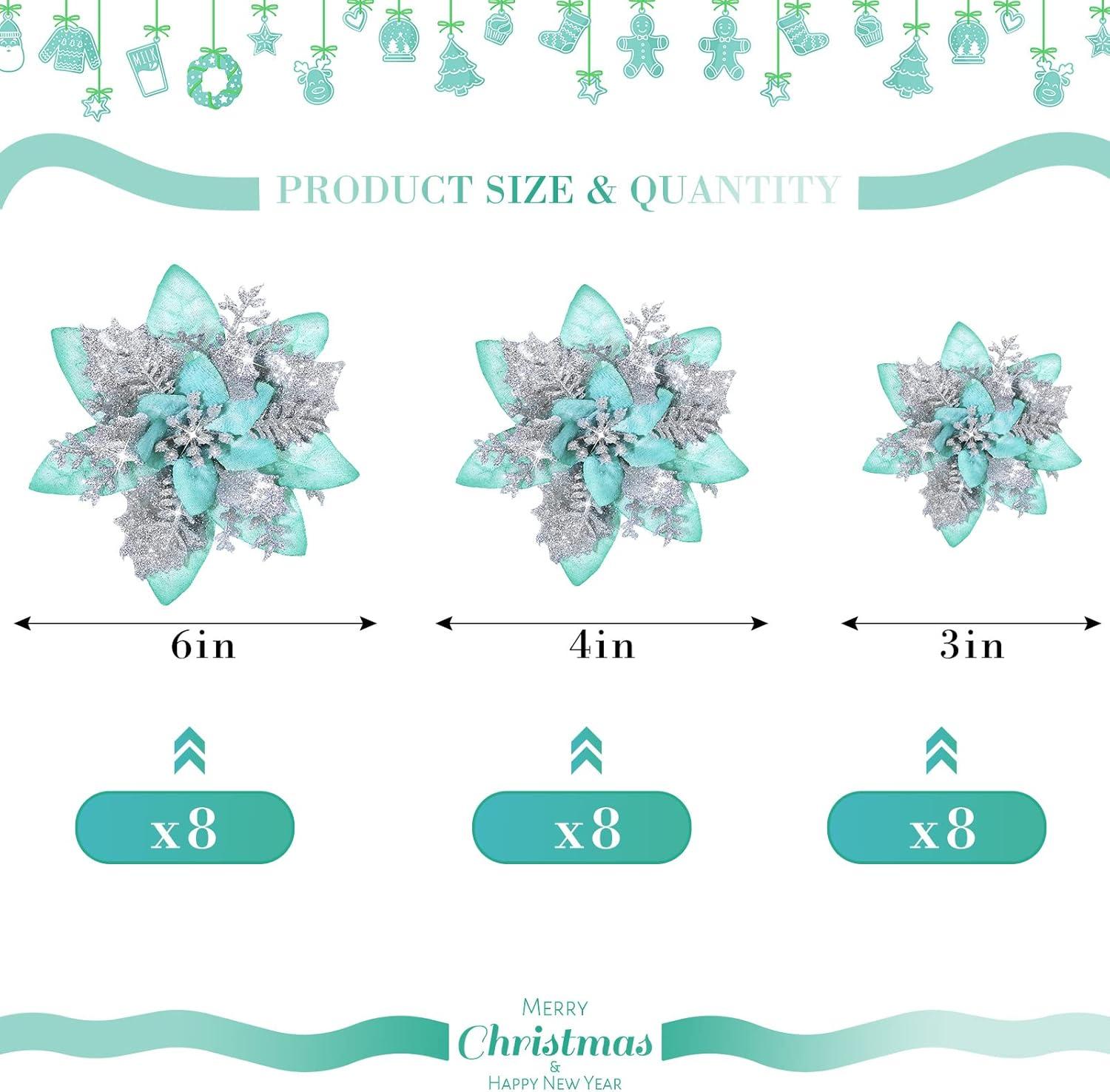 24 Christmas Glitter Artificial Poinsettia Flowers Xmas Poinsettia Artificial Wedding Flowers Decorations Xmas Tree Ornaments with Clips for Party Favors, 6 Inch, 4 Inch, 3 Inch (Silver and Blue)(Silver and Green)