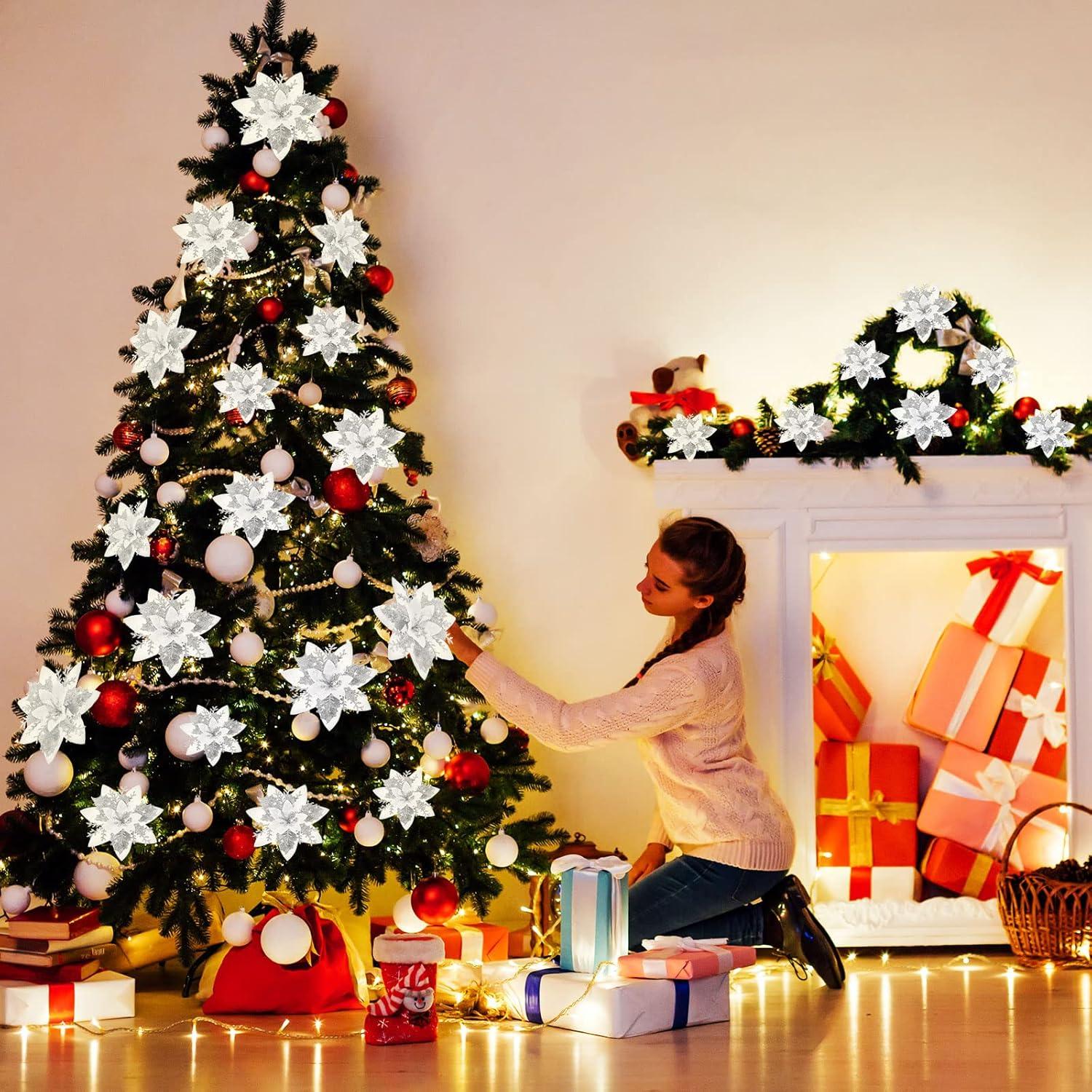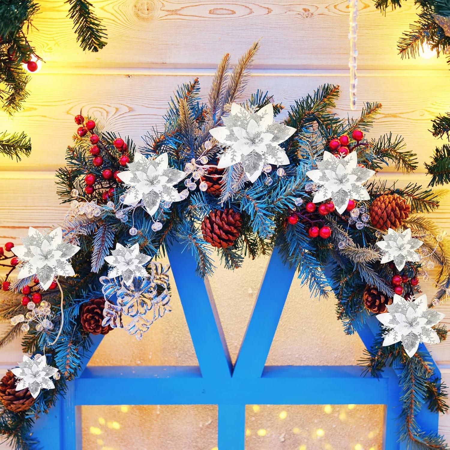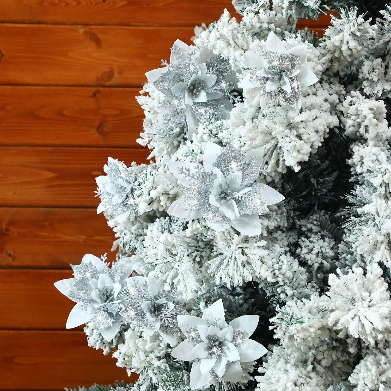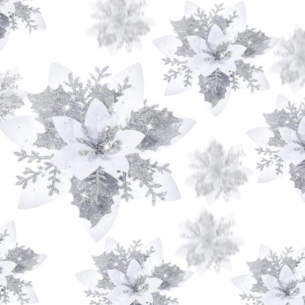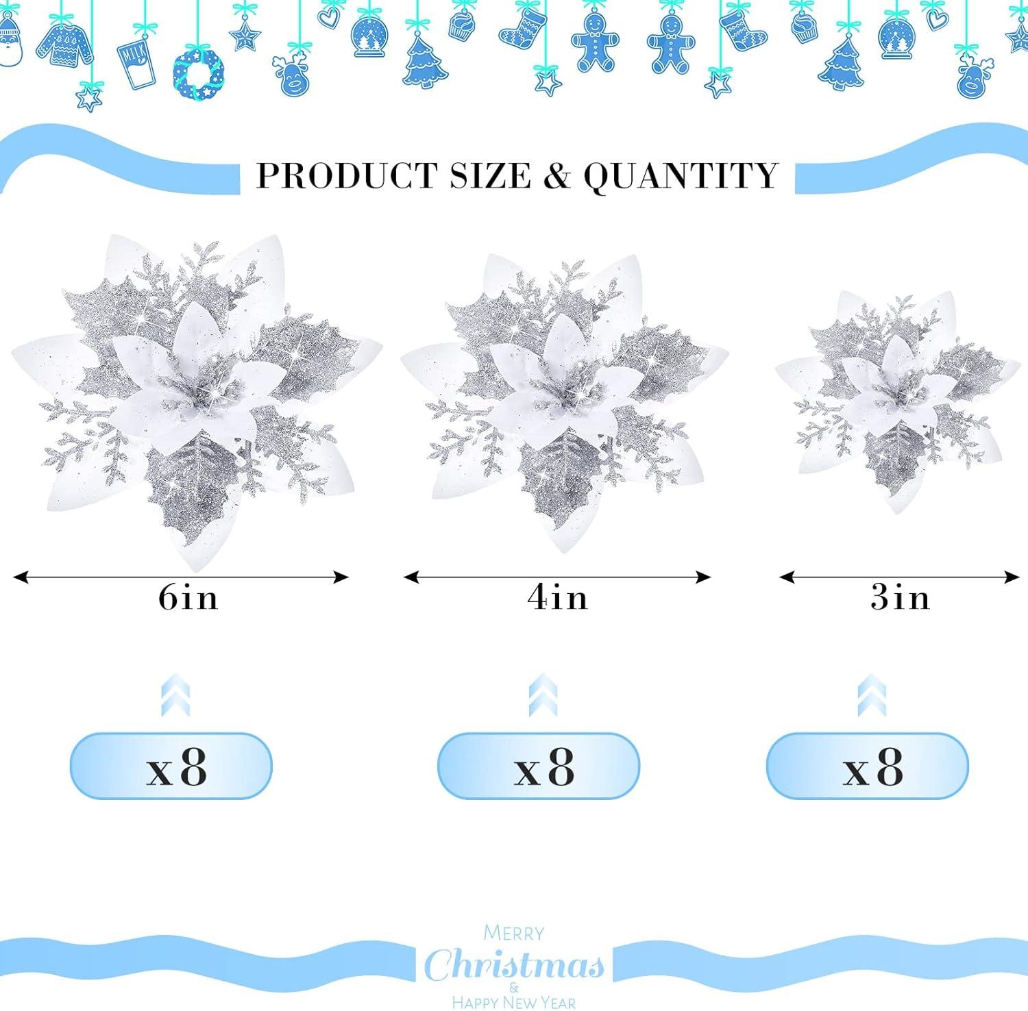 image24 Christmas Glitter Artificial Poinsettia Flowers Xmas Poinsettia Artificial Wedding Flowers Decorations Xmas Tree Ornaments with Clips for Party Favors 6 Inch 4 Inch 3 Inch Silver and BlueSilver and White