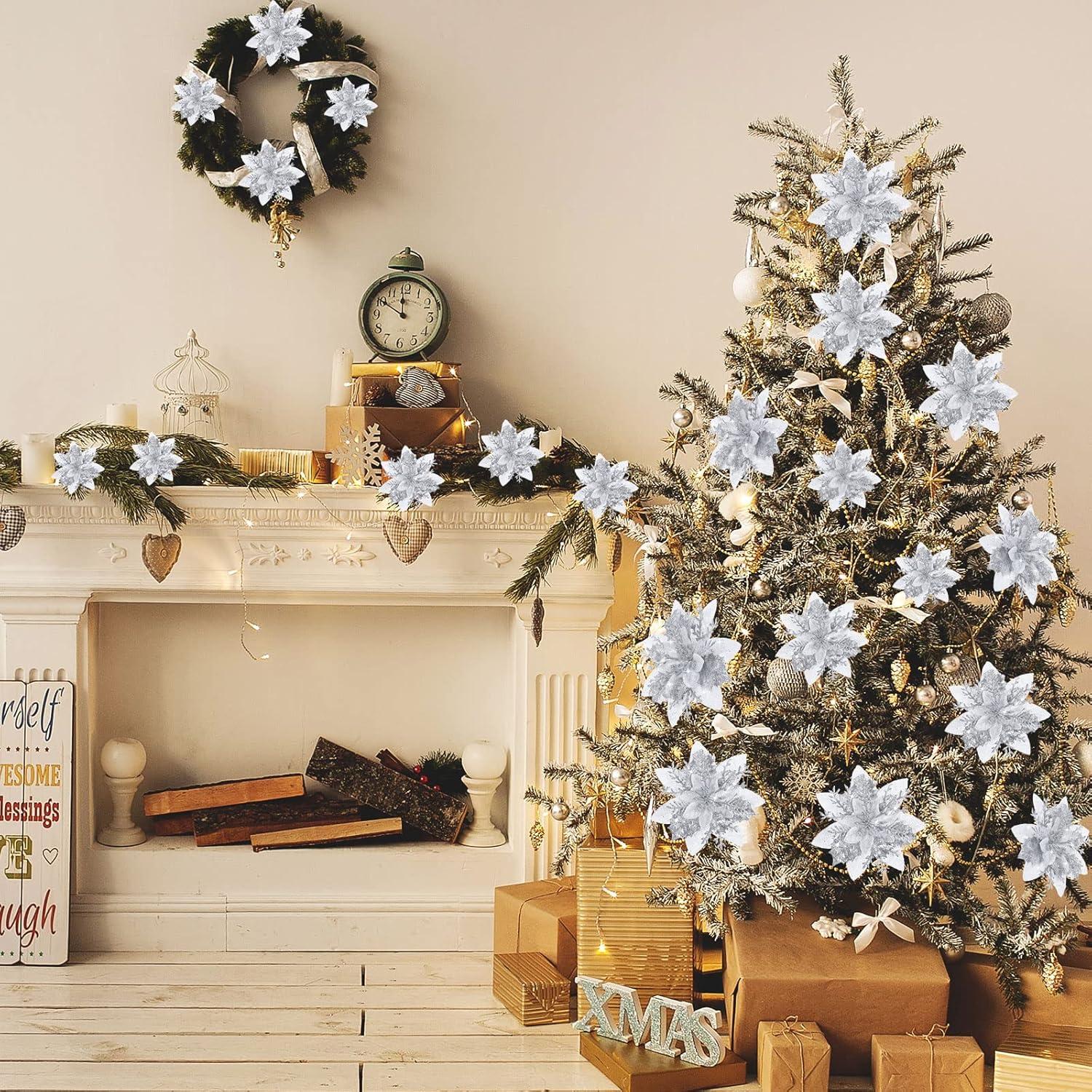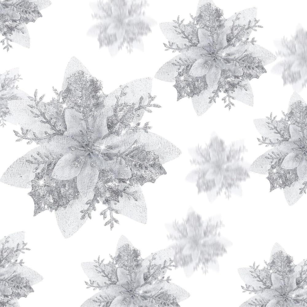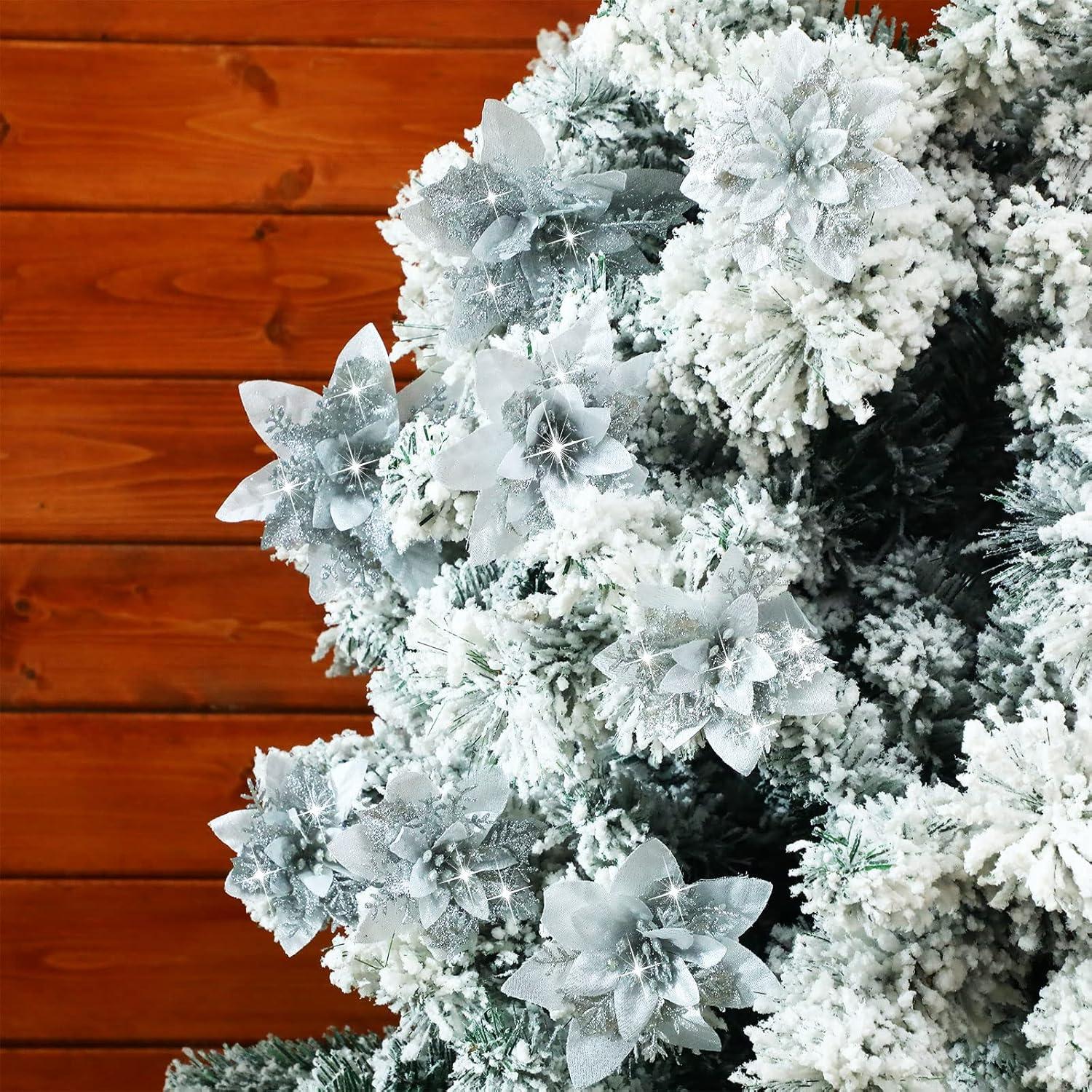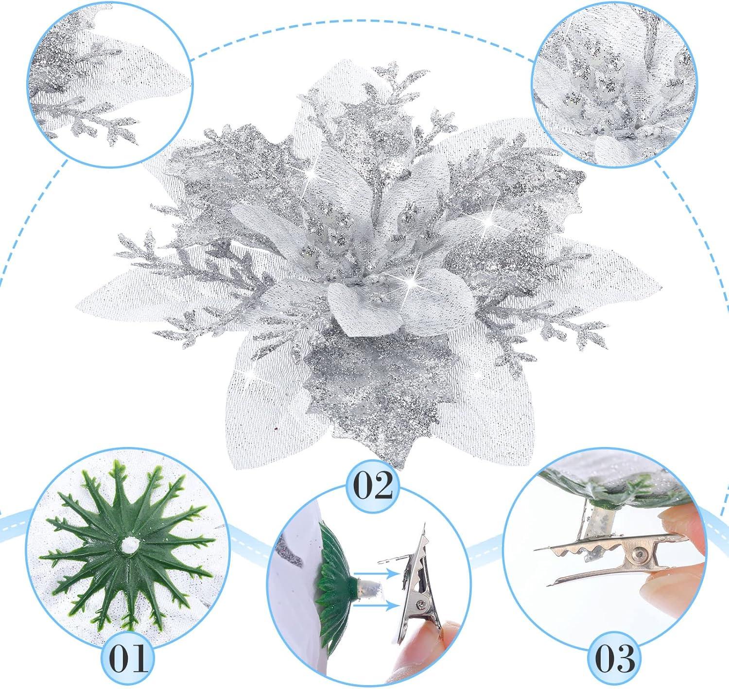 image24 Christmas Glitter Artificial Poinsettia Flowers Xmas Poinsettia Artificial Wedding Flowers Decorations Xmas Tree Ornaments with Clips for Party Favors 6 Inch 4 Inch 3 Inch Silver and BlueSilver