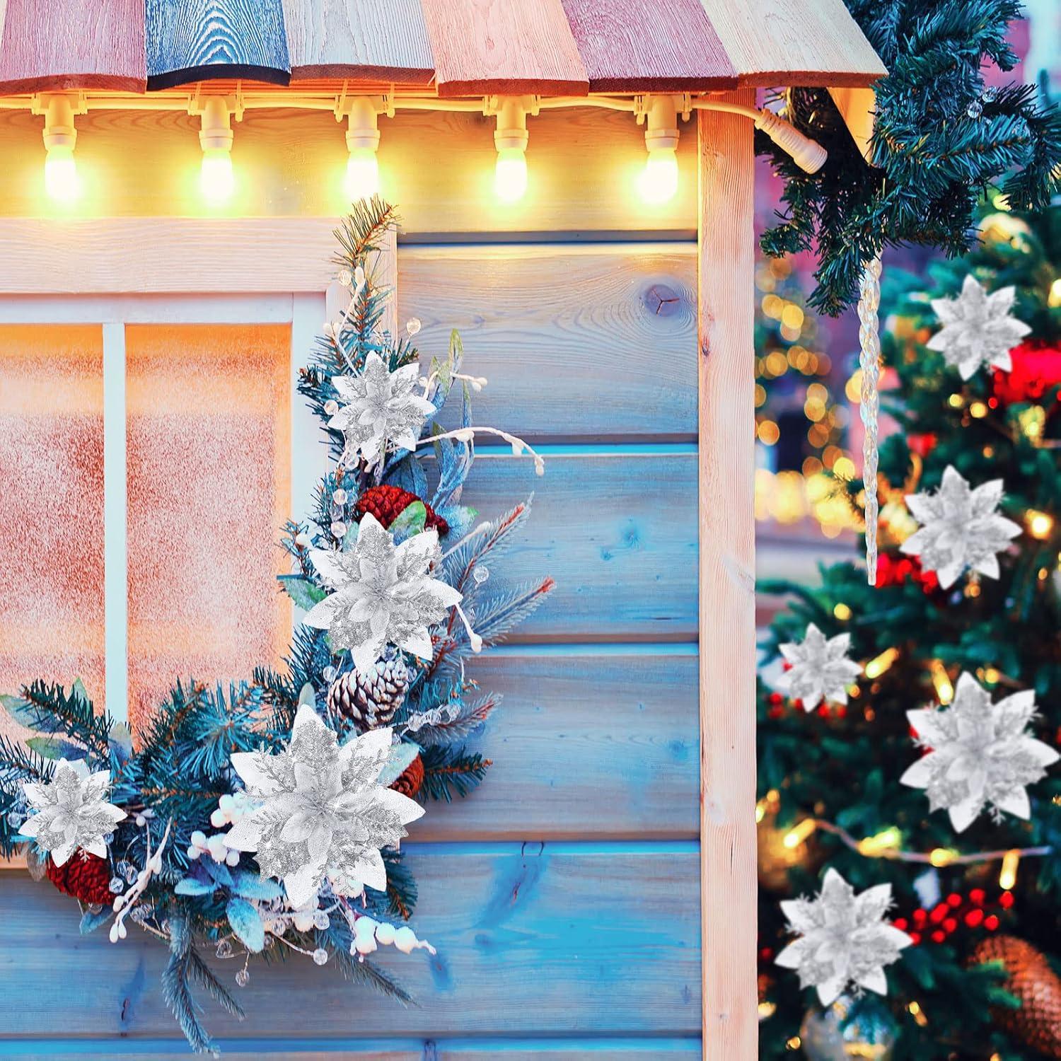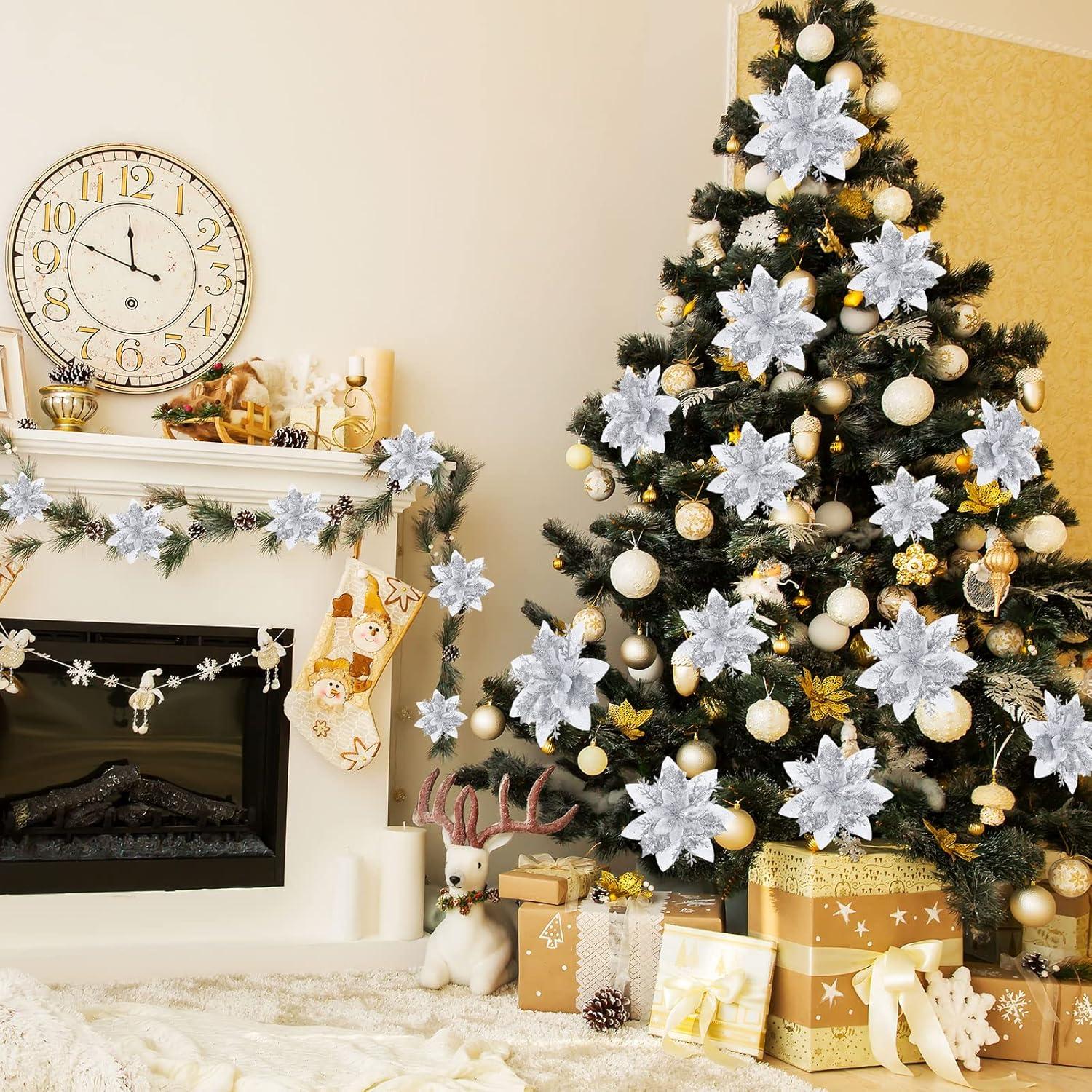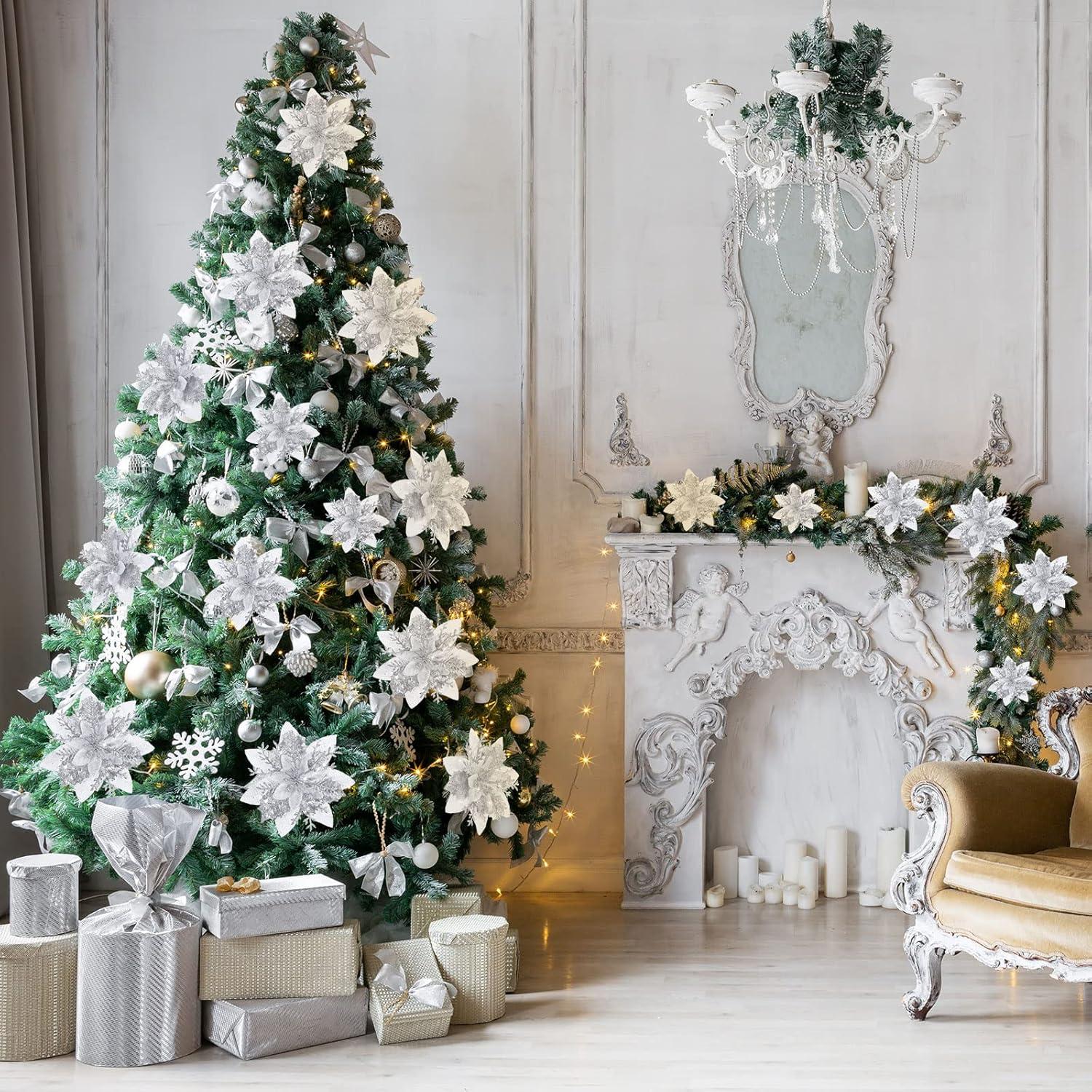 image24 Christmas Glitter Artificial Poinsettia Flowers Xmas Poinsettia Artificial Wedding Flowers Decorations Xmas Tree Ornaments with Clips for Party Favors 6 Inch 4 Inch 3 Inch Silver and BlueSilver