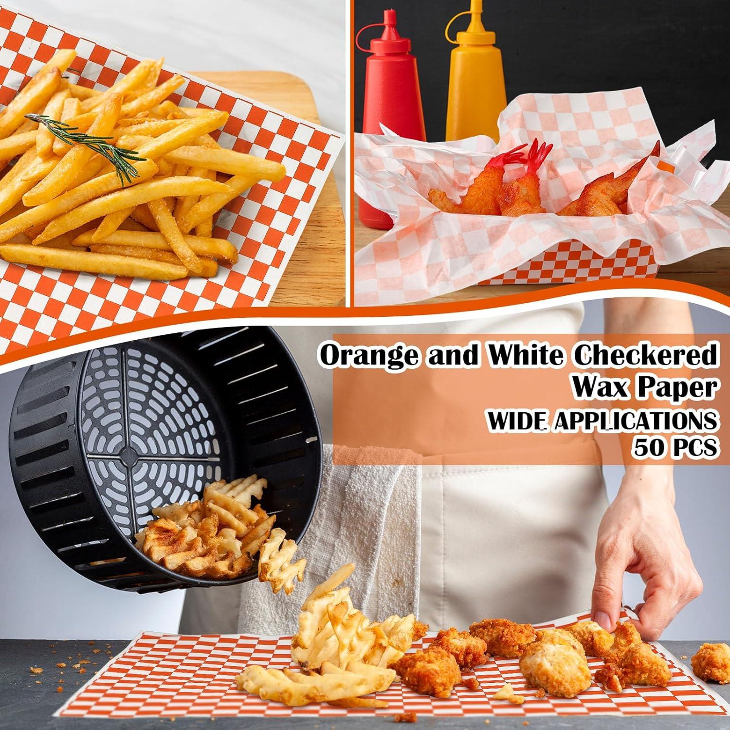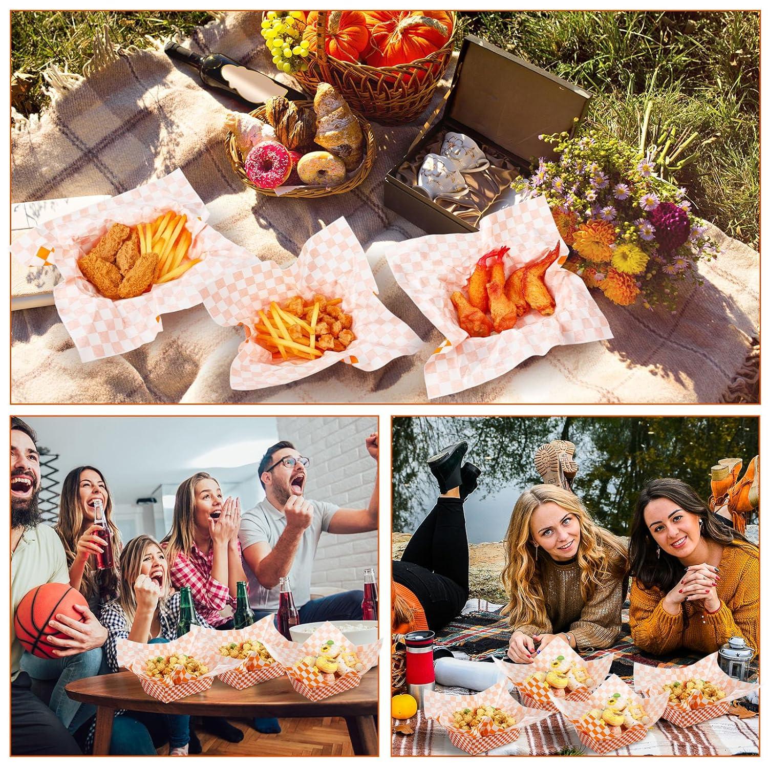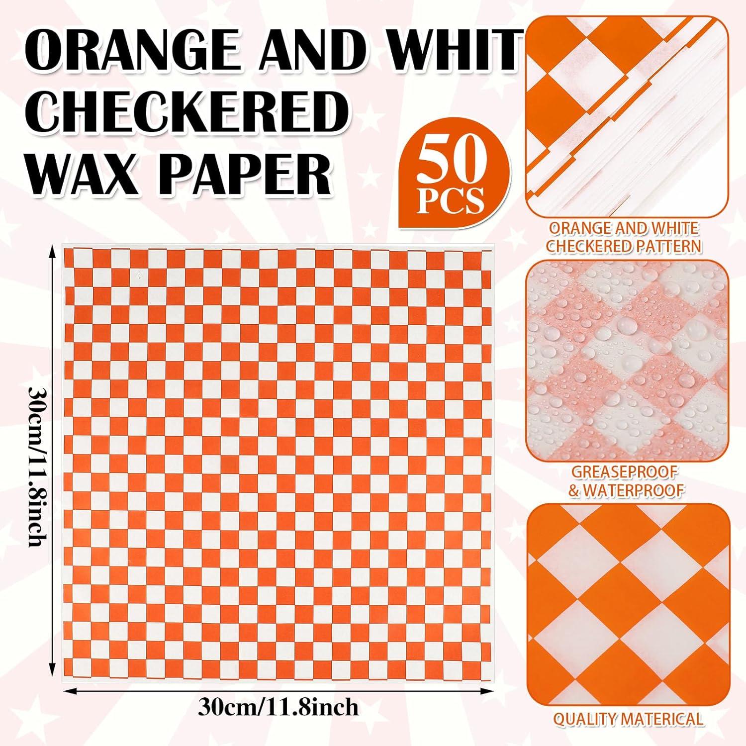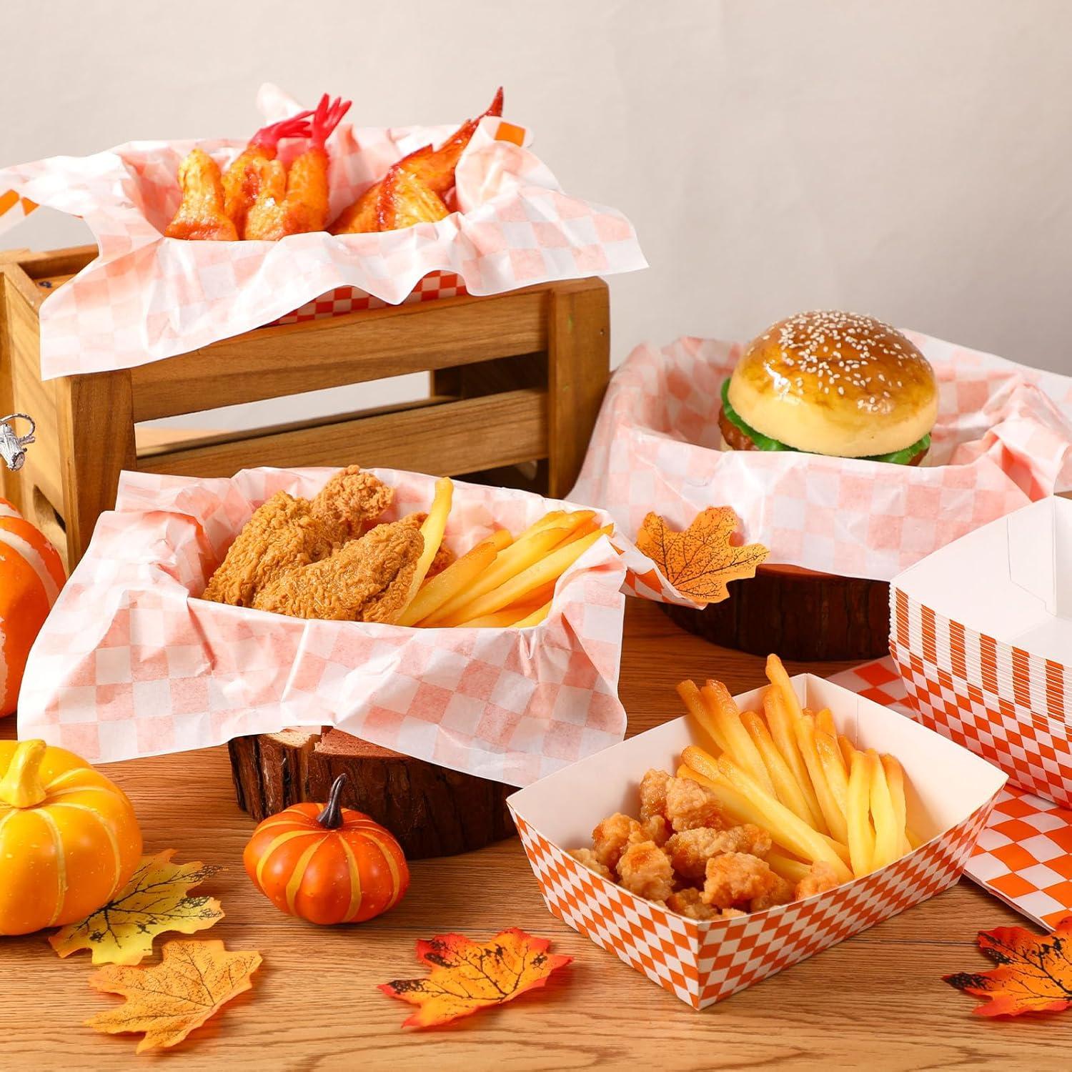 Quality Material: these orange and black checkered food tray boats are made of thick kraft paper, grease resistant and waterproof, suitable for serving as a heated and fried food container, and each baking sandwich wrap paper is made of wax paper, reliable and odorless, and not easy to tear