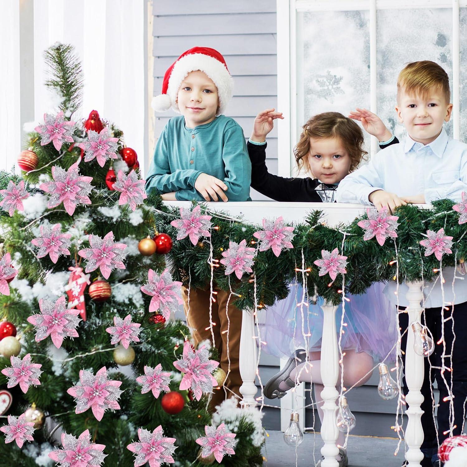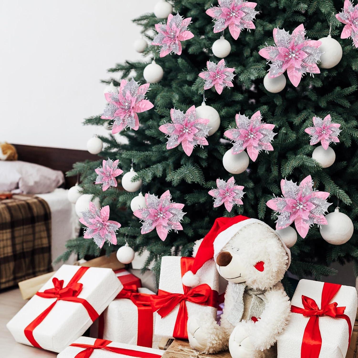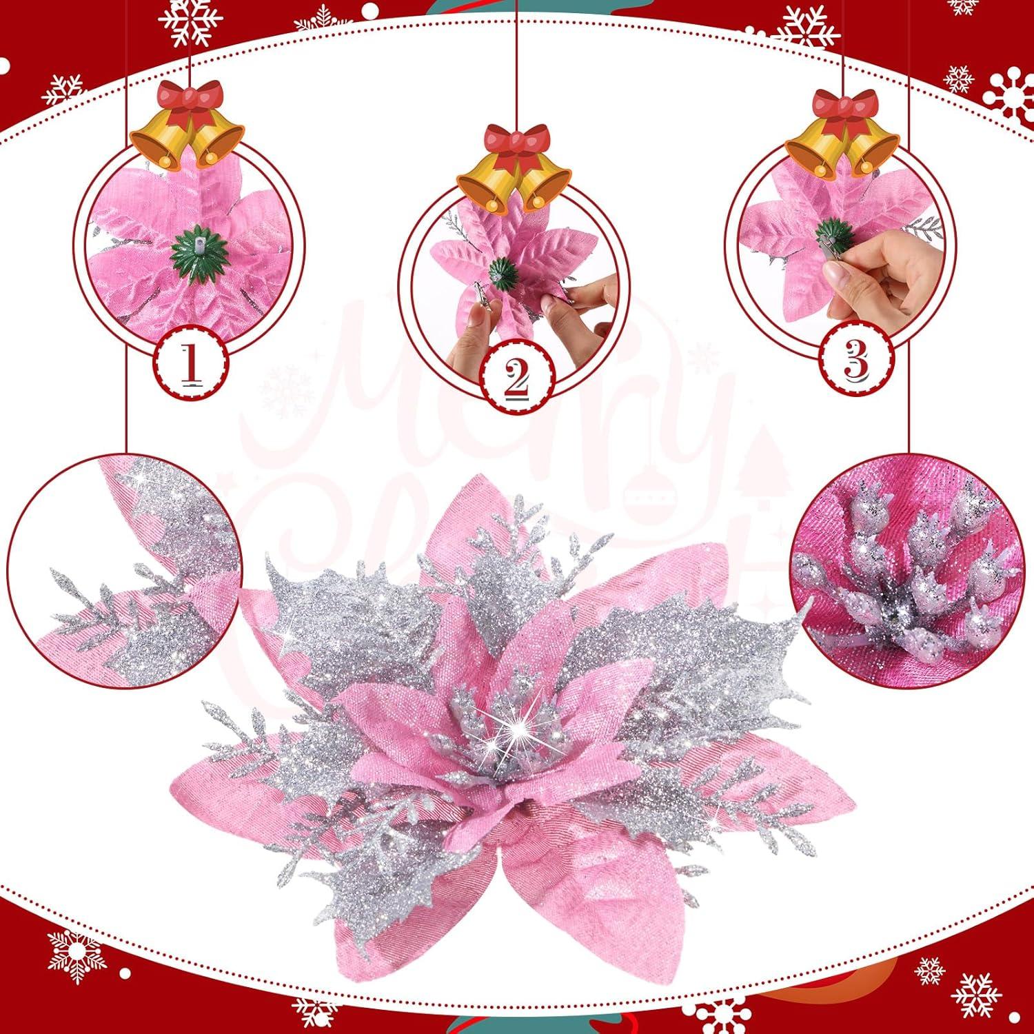 Geosar 36 Pcs Christmas Glitter Artificial Poinsettia Flowers Xmas Poinsettia Artificial Wedding Flowers Decorations Xmas Tree Ornaments with Clips for Party, 6 Inch, 4 Inch, 3 Inch(Rose Gold)(Peach Pink Silver)