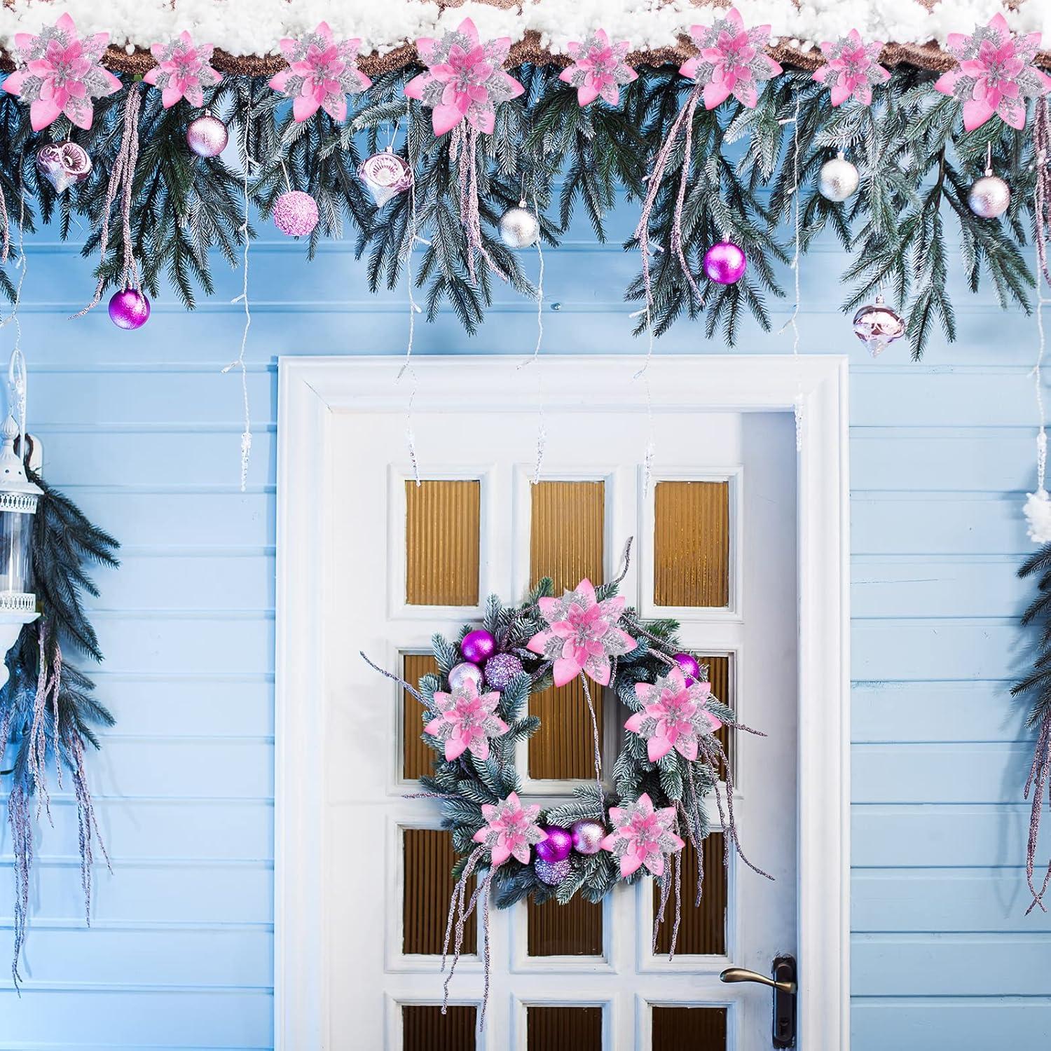 Geosar 36 Pcs Christmas Glitter Artificial Poinsettia Flowers Xmas Poinsettia Artificial Wedding Flowers Decorations Xmas Tree Ornaments with Clips for Party, 6 Inch, 4 Inch, 3 Inch(Rose Gold)(Pink and Silver)